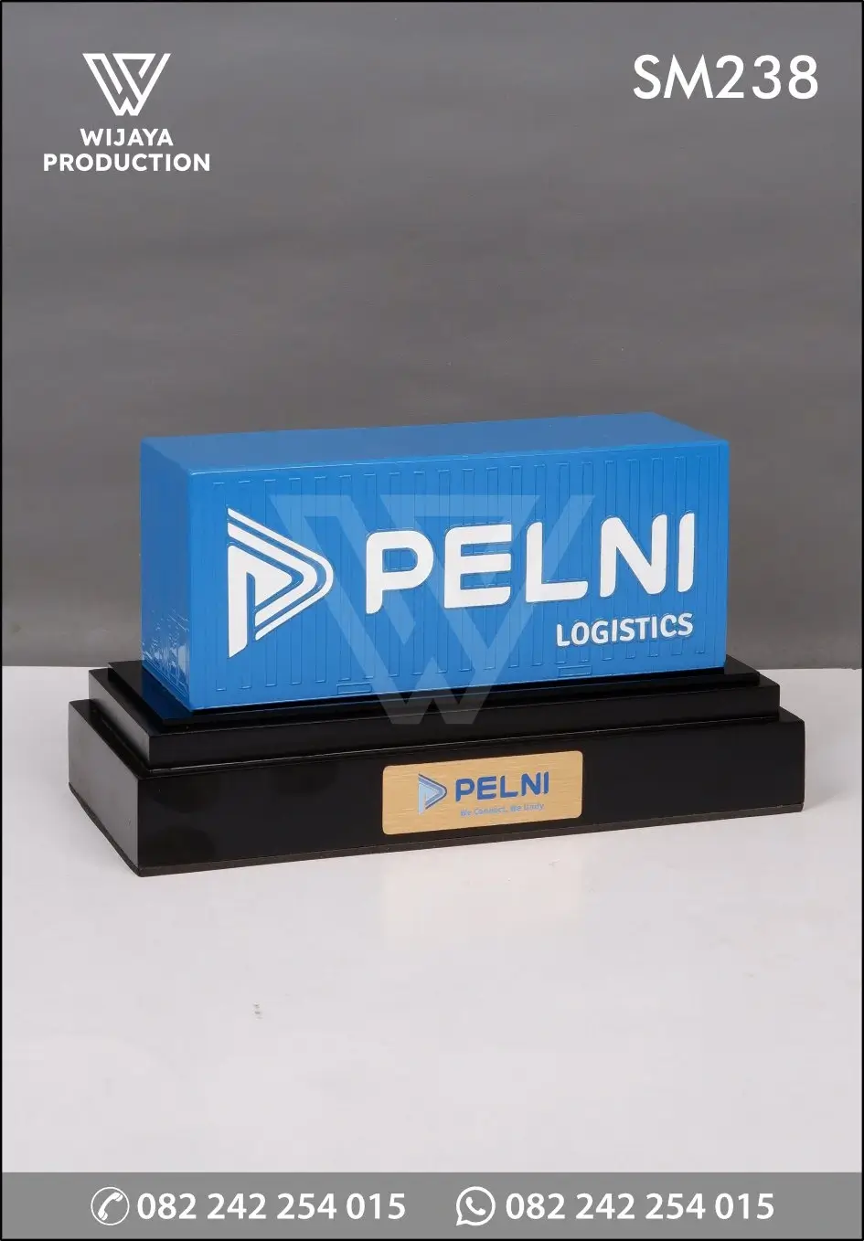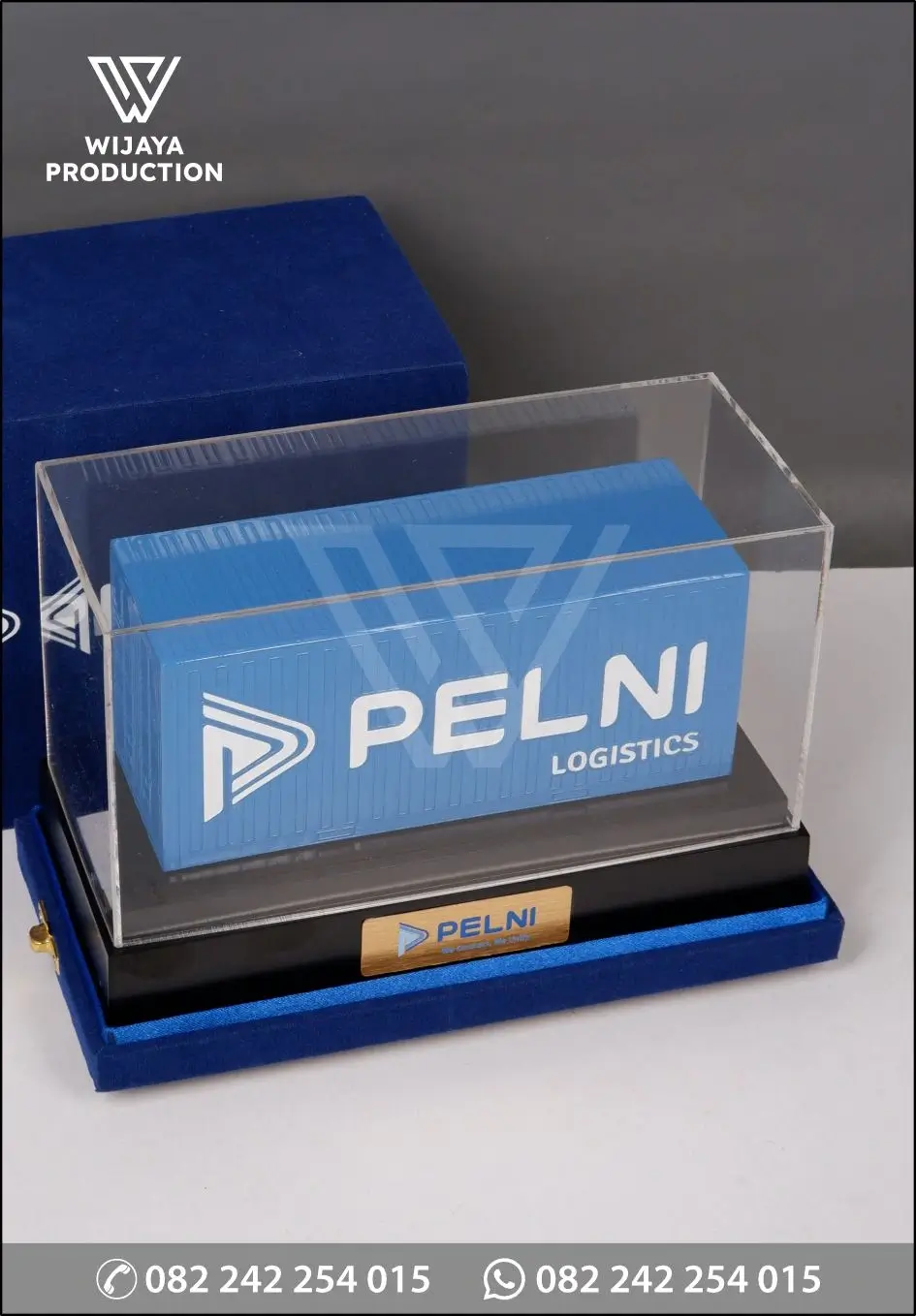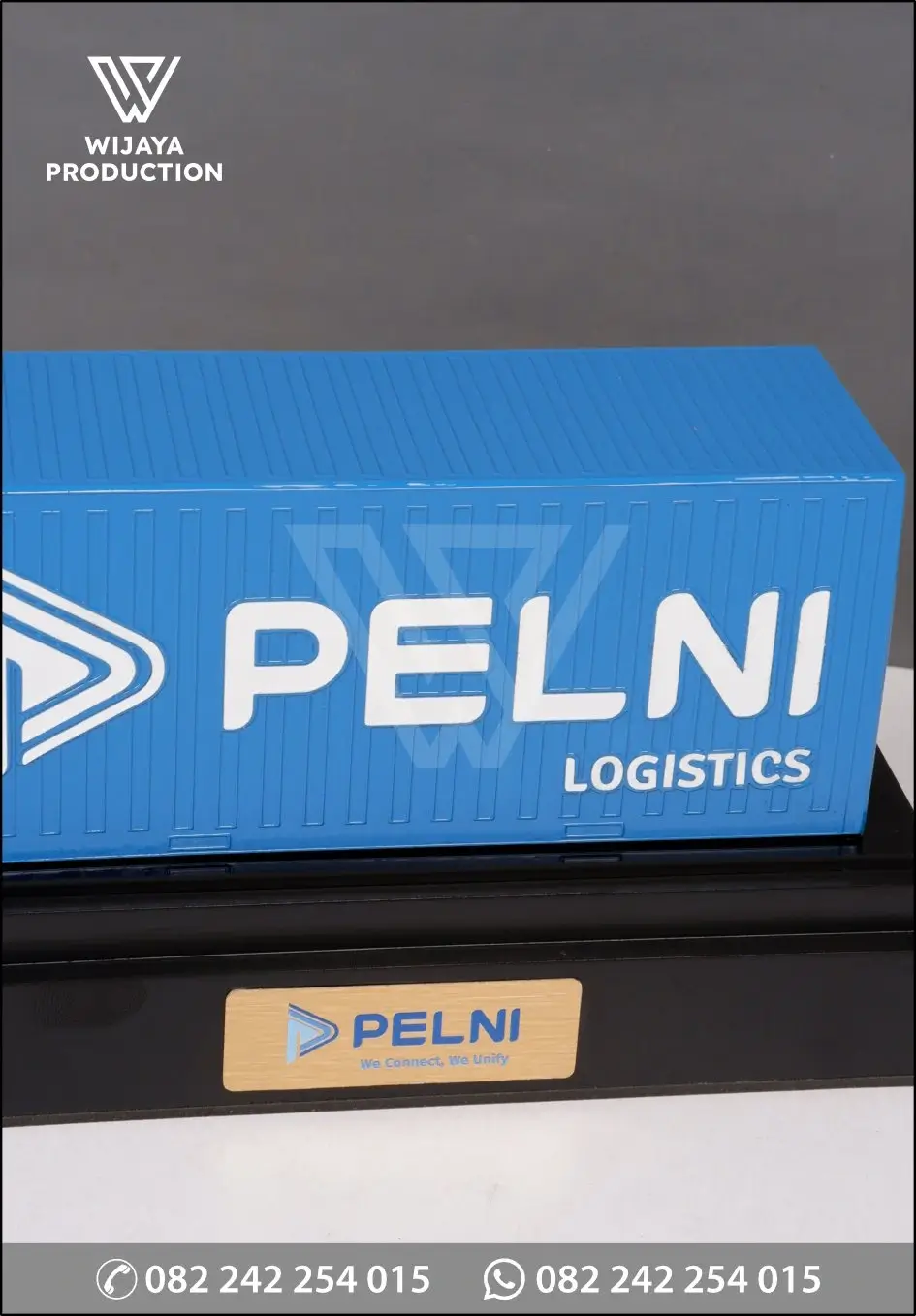 Bagian utama miniatur didesain dengan tingkat akurasi tinggi, mereplika tekstur corrugated (bergelombang) khas peti kemas yang presisi. Dibalut dengan finishing warna biru laut yang merepresentasikan identitas perusahaan, miniatur ini dilengkapi dengan decal logo “PELNI LOGISTICS” yang tajam dan kontras. Kontainer eksklusif ini ditempatkan di atas base kayu solid bertingkat dengan finishing hitam glossy yang kokoh dan mewah. Pada bagian depan dudukan, tersemat plat logam kuningan yang dicetak secara custom memuat logo instansi beserta tagline perusahaan (“We Connect, We Unify”), memberikan sentuhan personalisasi yang berkelas.
