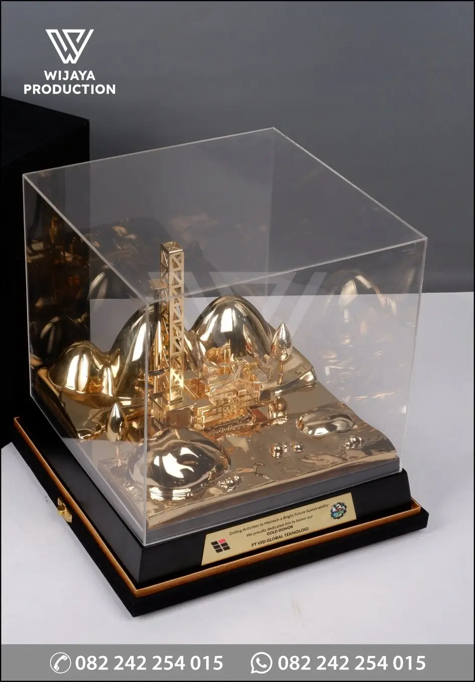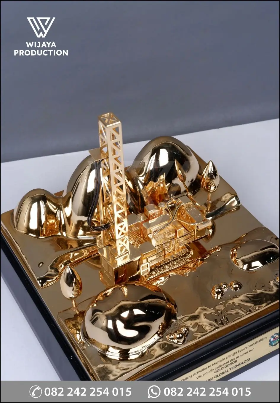 Bagian utama miniatur dikerjakan dengan tingkat presisi tinggi dan dibalut finishing gold plating (chrome emas) glossy secara menyeluruh, memancarkan aura kemewahan dan kejayaan. Menara rig didesain berdiri kokoh dan detail, dikelilingi oleh lanskap relief perbukitan dan pepohonan yang artistik, menonjolkan aspek eco-friendly operations. Karya seni logam prestisius ini diletakkan di atas base kayu solid berbentuk persegi bertingkat dengan finishing hitam elegan yang sangat kontras dan menawan. Pada bagian depan base, tersemat plat logam custom yang memuat pesan keberlanjutan (“Drilling Activities to Maintain a Bright Future Sustainability”), status apresiasi “GOLD DONOR”, nama perusahaan penerima (contoh: PT Visi Global Teknologi), serta logo acara terkait (seperti Bulan K3 Nasional).