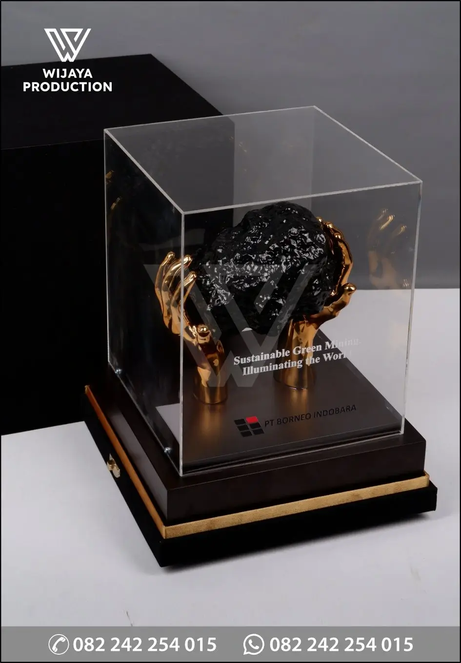Souvenir miniatur SM233 merupakan representasi simbolis industri pertambangan berkelanjutan, dirancang sebagai media apresiasi korporat yang elegan dan bermakna. Miniatur ini menampilkan replika bongkahan batubara hitam bertekstur realistis yang ditopang oleh dua tangan berfinishing emas, melambangkan komitmen terhadap pengelolaan sumber daya alam yang bertanggung jawab dan bernilai bagi masa depan.