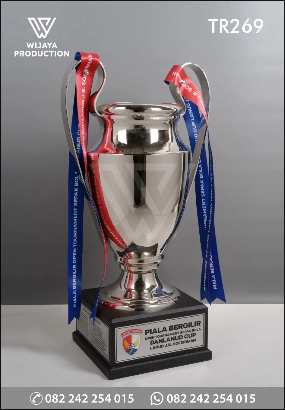 Contoh berikut merupakan Piala Bergilir Open Tournament Sepak Bola Danlanud Cup yang bisa dijadikan referensi desain untuk Anda. Piala yang terbuat dari material logam kuningan finishing etsa chrome nickel plated glossy yang ditatah manual model desain piala champion. Untuk bagian dudukan menggunakan material kayu warna hitam doff.