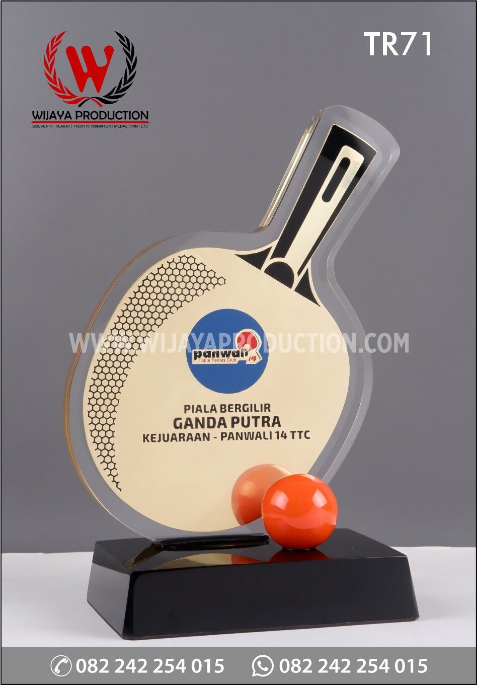 Sebagai bentuk penghargaan dalam kejuaraan pingpong atau tenis meja, dibuatlah piala bergilir menggunakan material bahan pilihan terbaik. Penggunaan material akrilik yang dikombinasikan dengan logam kuningan dengan finishing chrome emas yang membentuk bet tenis. Serta penggunaan material resin warna untuk membentuk bola pingpong dan dudukan piala.