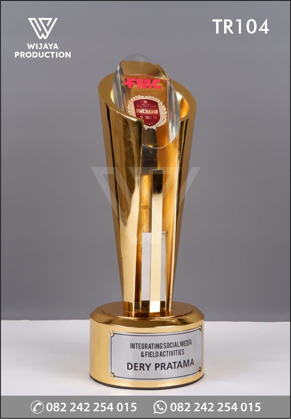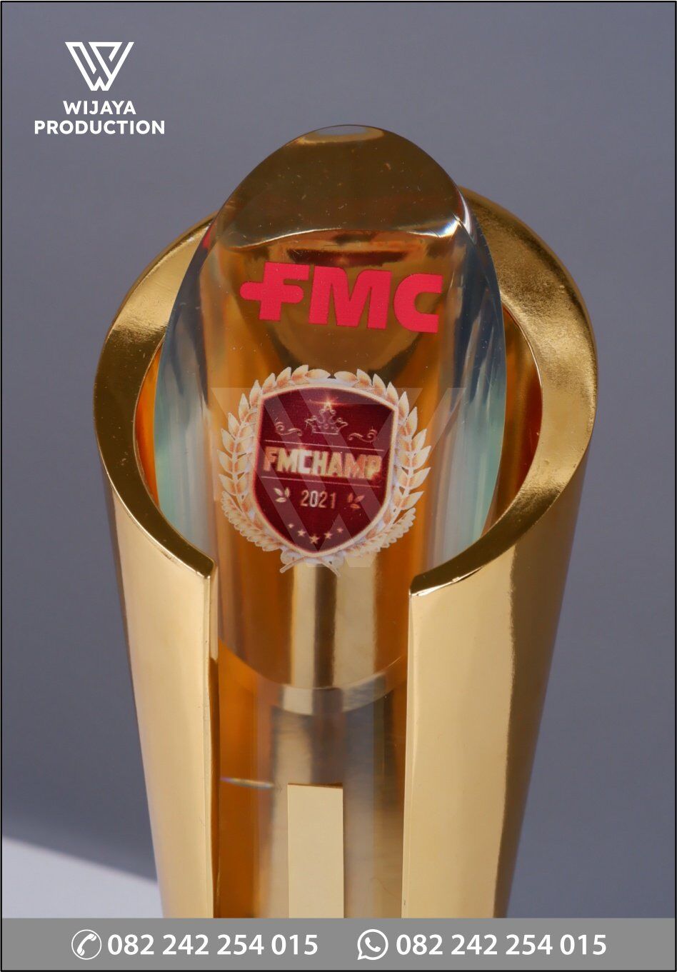 Contoh produk kali ini merupakan Piala penghargaan FMC FMChamp untuk kategori integrating social media & field activities. Piala yang terbuat dari material logam kuningan finishing chrome emas dan di kombinasikan dengan material resin bening transparan. Perpaduan logam dan resin memang cocok untuk dijadikan sebuah penghargaan bergengsi.