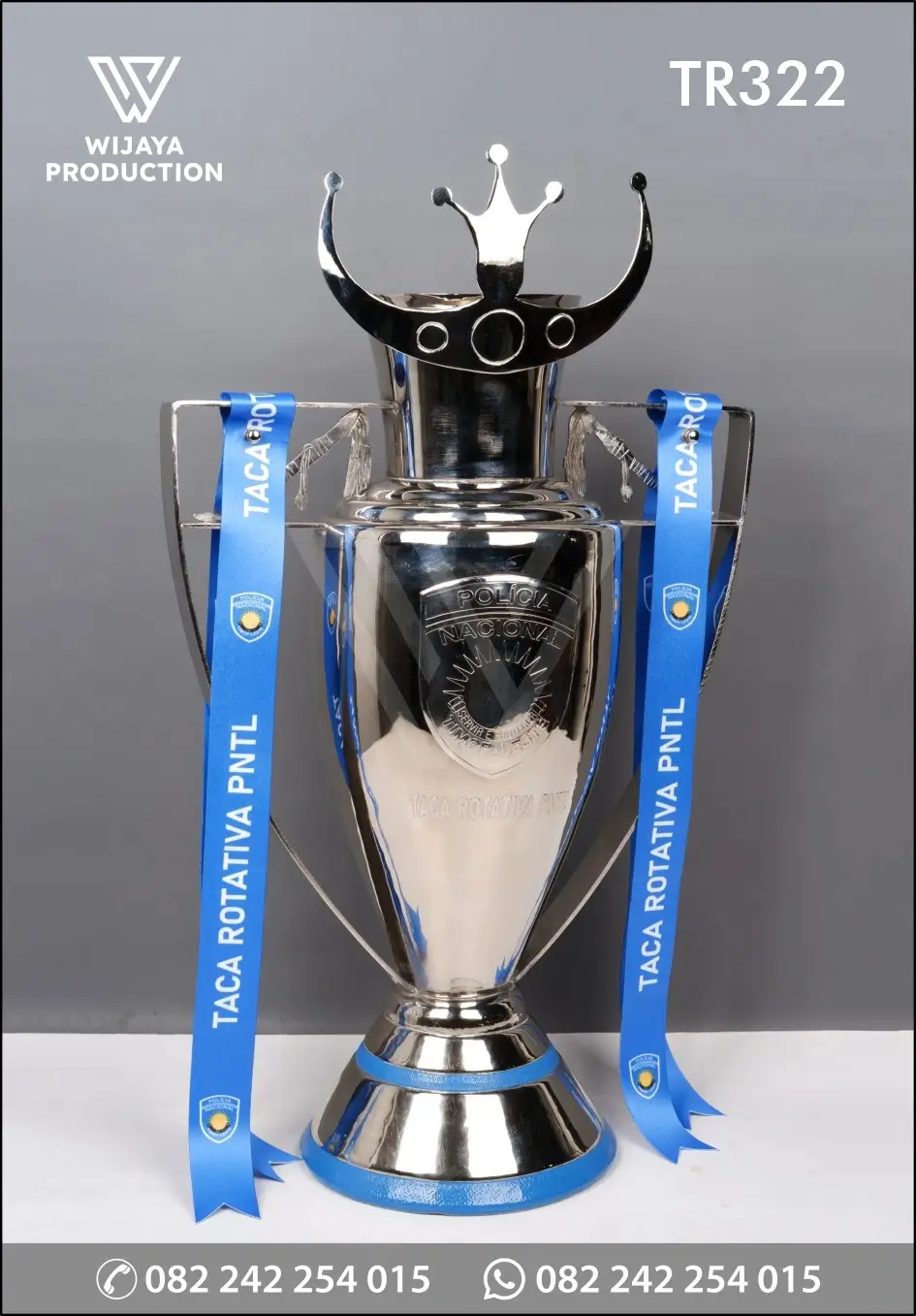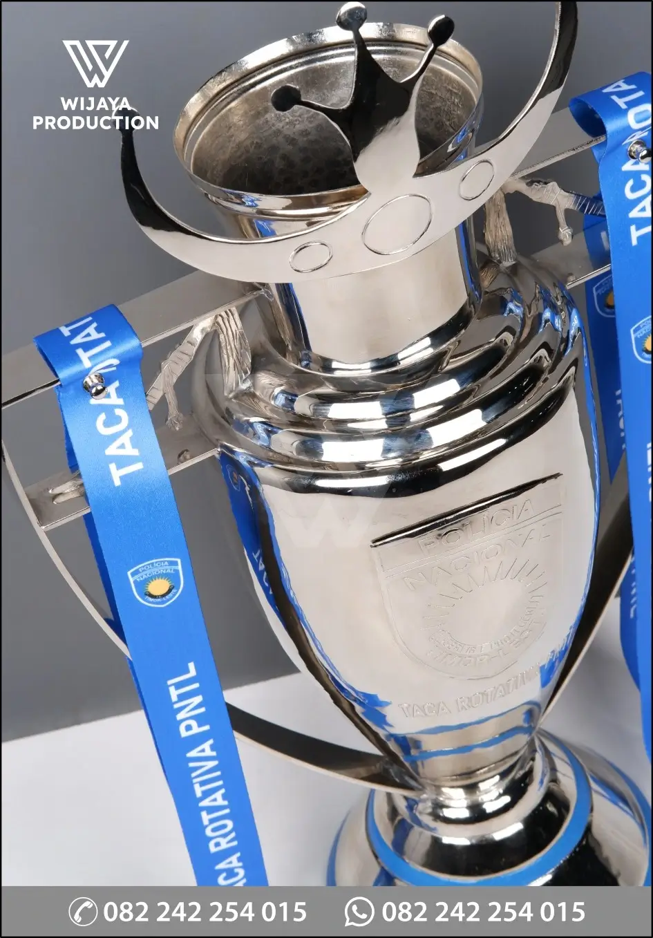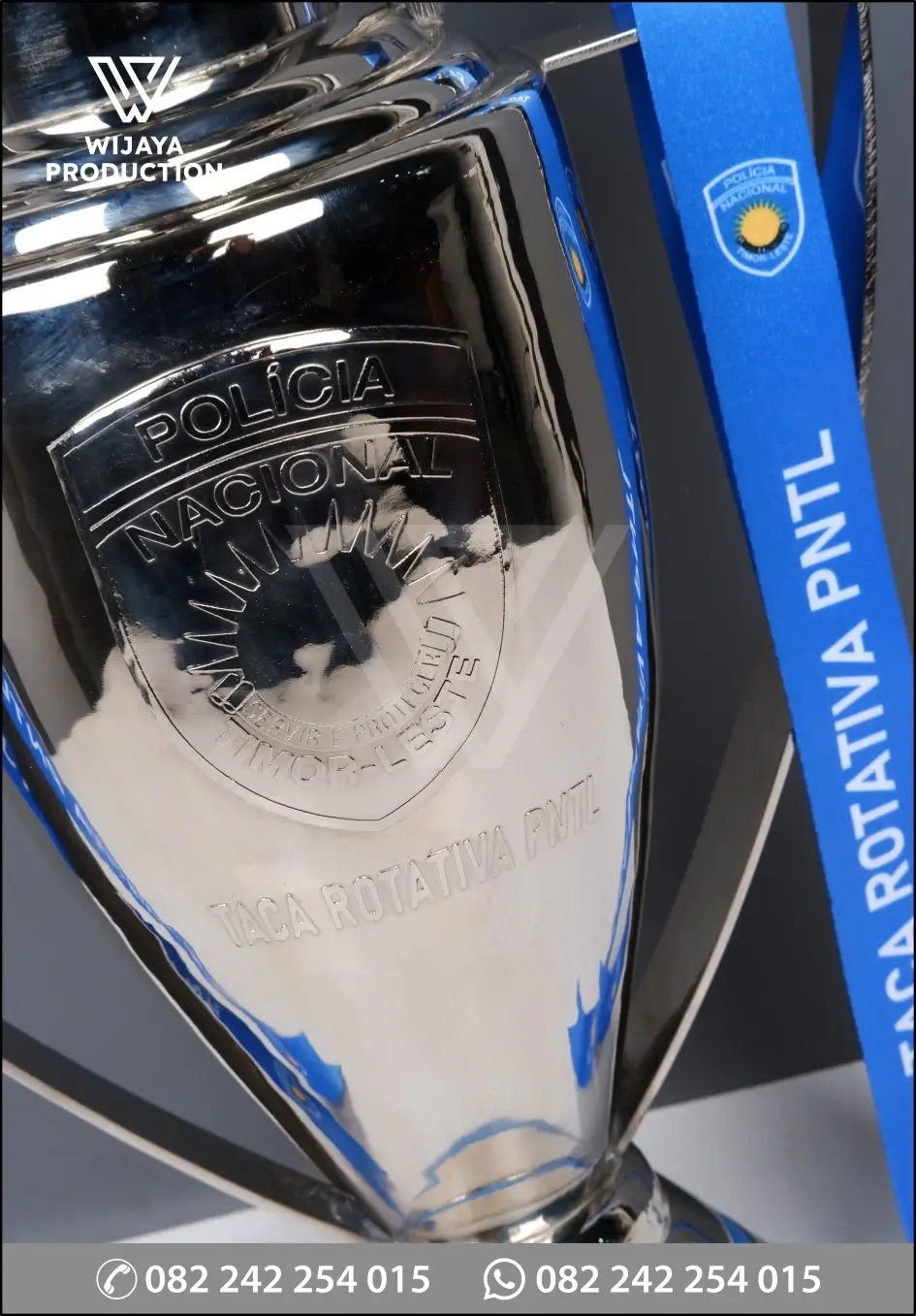 Contoh berikut merupakan Piala Futsal Taca Rotativa PNTL yang bisa dijadikan referensi desain untuk Anda. Piala yang terbuat dari material logam kuningan finishing chrome nickel glossy model desain custom disertai pita satin materi logo & tulisan printing.