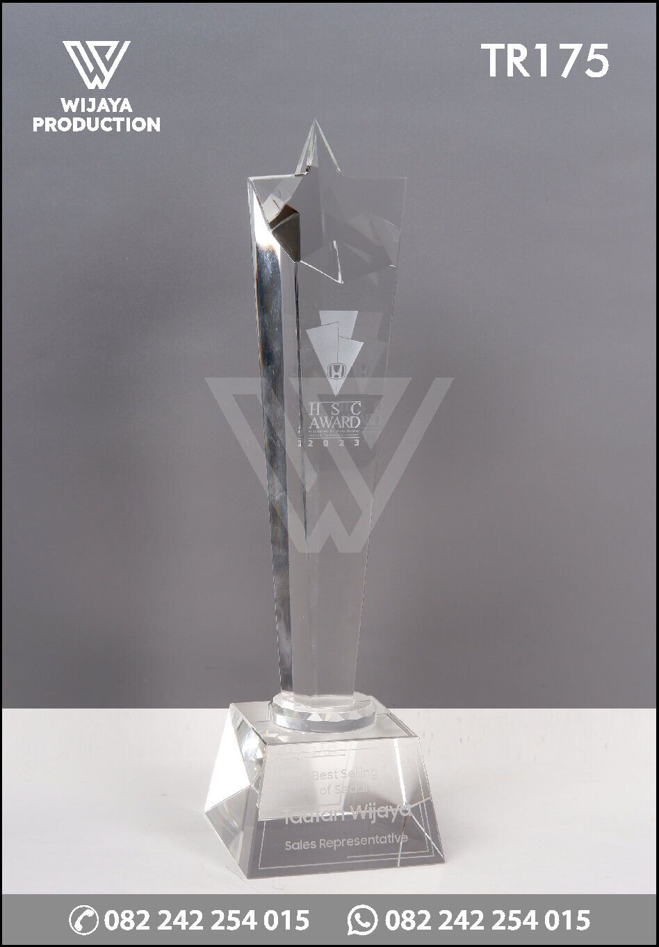 Contoh berikut merupakan Piala HSC Award yang bisa dijadikan referensi desain untuk Anda. Piala yang terbuat dari material kristal dengan bentuk desain bintang yang berisikan materi logo dan tulisan acara menggunakan teknik grafir.