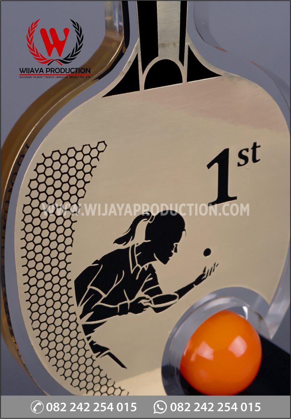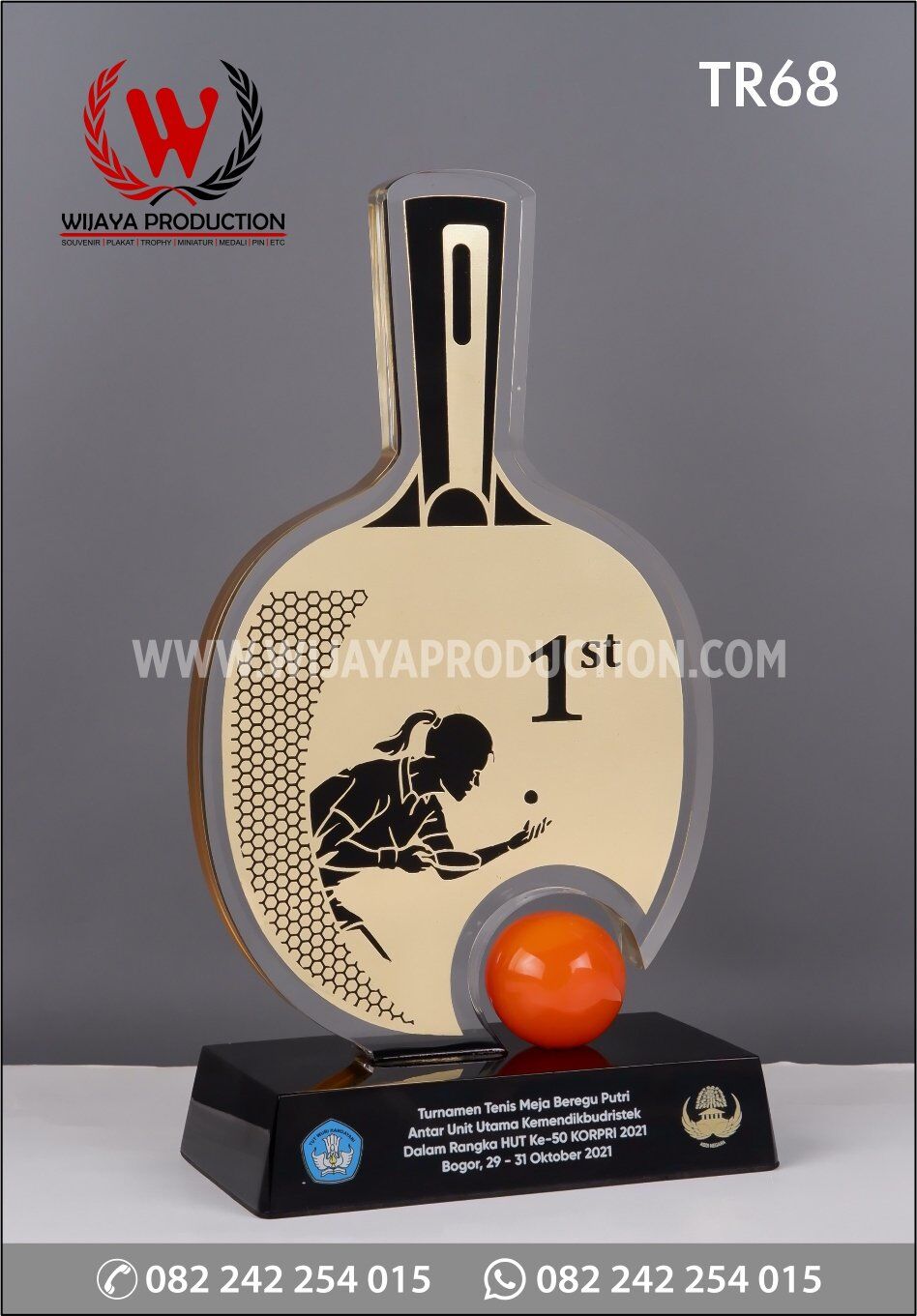 Salah satu bentuk piala untuk turnamen tenis meja dalam rangka HUT ke-50 KORPRI 2021. Terbuat dari perpaduan material seperti akrilik, logam kuningan dan resin. Pada bagian akrilik, cutting akrilik menggunakan mesin laser terbaik kami untuk menghasilkan sisi dan permukaan yang halus. Dan, untuk logam kuningan dengan finishing chrome emas yang membentuk bet tenis yang dipadukan dengan akrilik. Untuk dudukan dan bola tenis menggunakan material resin warna solid.