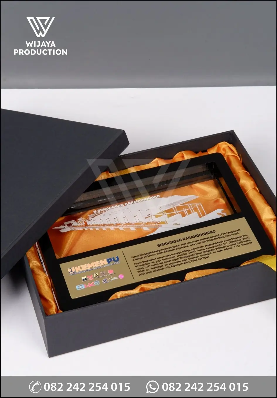 Salah satu jenis cinderamata penghargaan unik yang di aplikasikan ke dalam bentuk plakat. Plakat Akrilik Bendungan Karangnongko KEMENPU yang bisa dijadikan referensi desain untuk Anda. Terbuat dari material akrilik bening & hitam model desain custom lapis materi gambar bendungan grafir. Untuk bagian plat kuningan berisi materi logo & tulisan yang menggunakan teknik uv print.