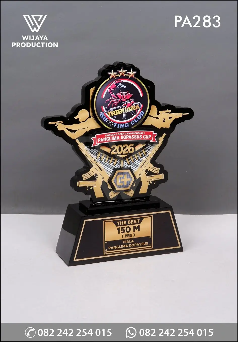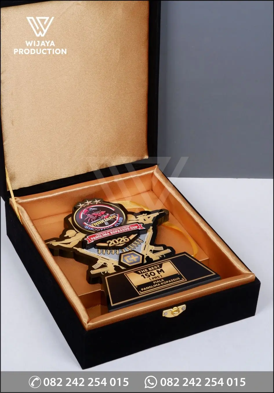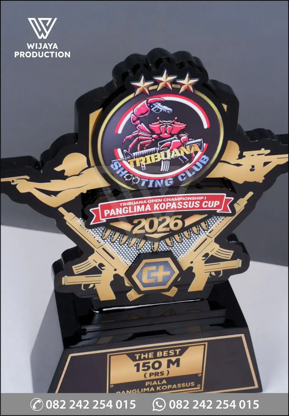Berikan apresiasi tertinggi bagi para juara dengan Plakat Akrilik Kejuaraan Menembak, sebuah trofi dan cinderamata eksklusif yang dirancang khusus untuk ajang kompetisi bergengsi. Seperti contoh pada gambar, plakat ini dipersembahkan untuk pemenang kategori “The Best 150 M (PRS)” pada ajang Tribuana Open Championship I – Panglima Kopassus Cup 2026. Desainnya yang gagah merepresentasikan ketangguhan, presisi, dan kebanggaan sejati dari sang juara.