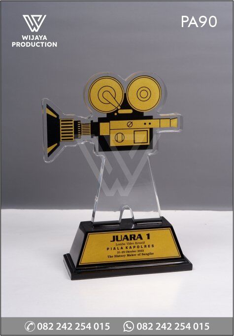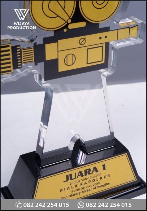 Salah satu bentuk penghargaan yang di aplikasikan ke dalam bentuk plakat untuk acara lomba video kreatif. plakat yang sudah di desain custom menyesuaikan konsep acara. Terbuat dari material dasar akrilik bening dengan bentuk cutting kamera video mengikuti materi gambar yang menggunakan teknik uv pint flatbed. Untuk bagian dudukan menggunakan material resin solid warna hitam.