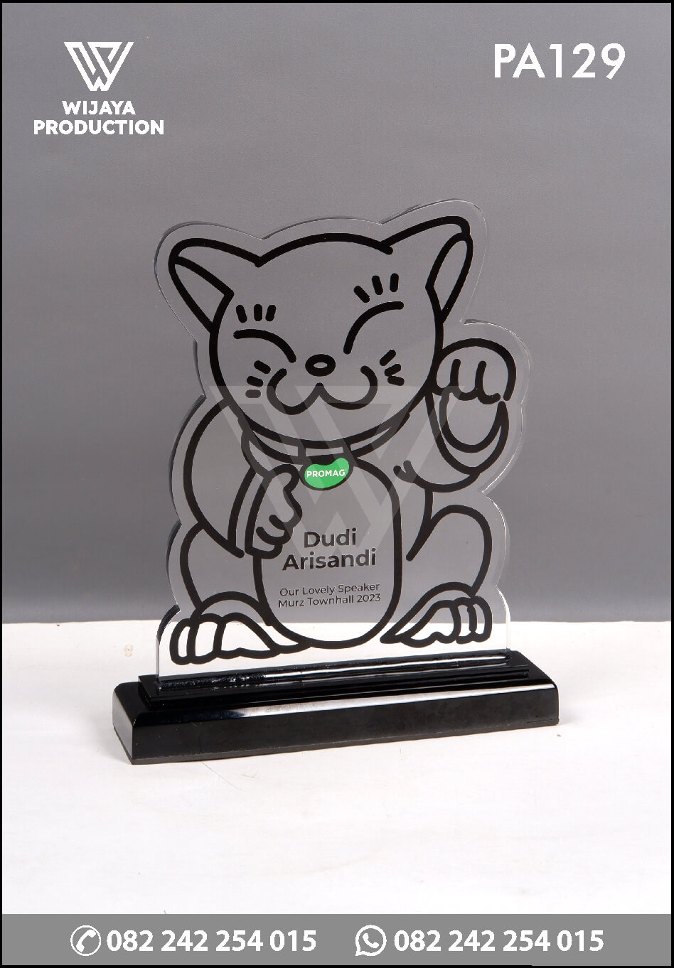 Salah satu tandamata penghargaan atau apresiasi yang di aplikasikan ke dalam bentuk plakat. Plakat yang bisa dijadikan referensi desain untuk Anda. Terbuat dari material akrilik bening dengan bentuk model desain maneki neko yang menggunakan teknik uv print.