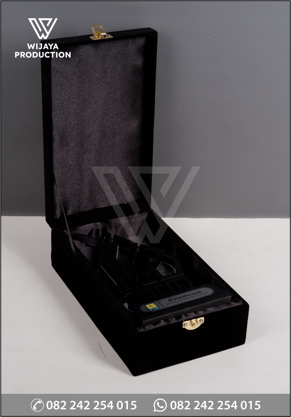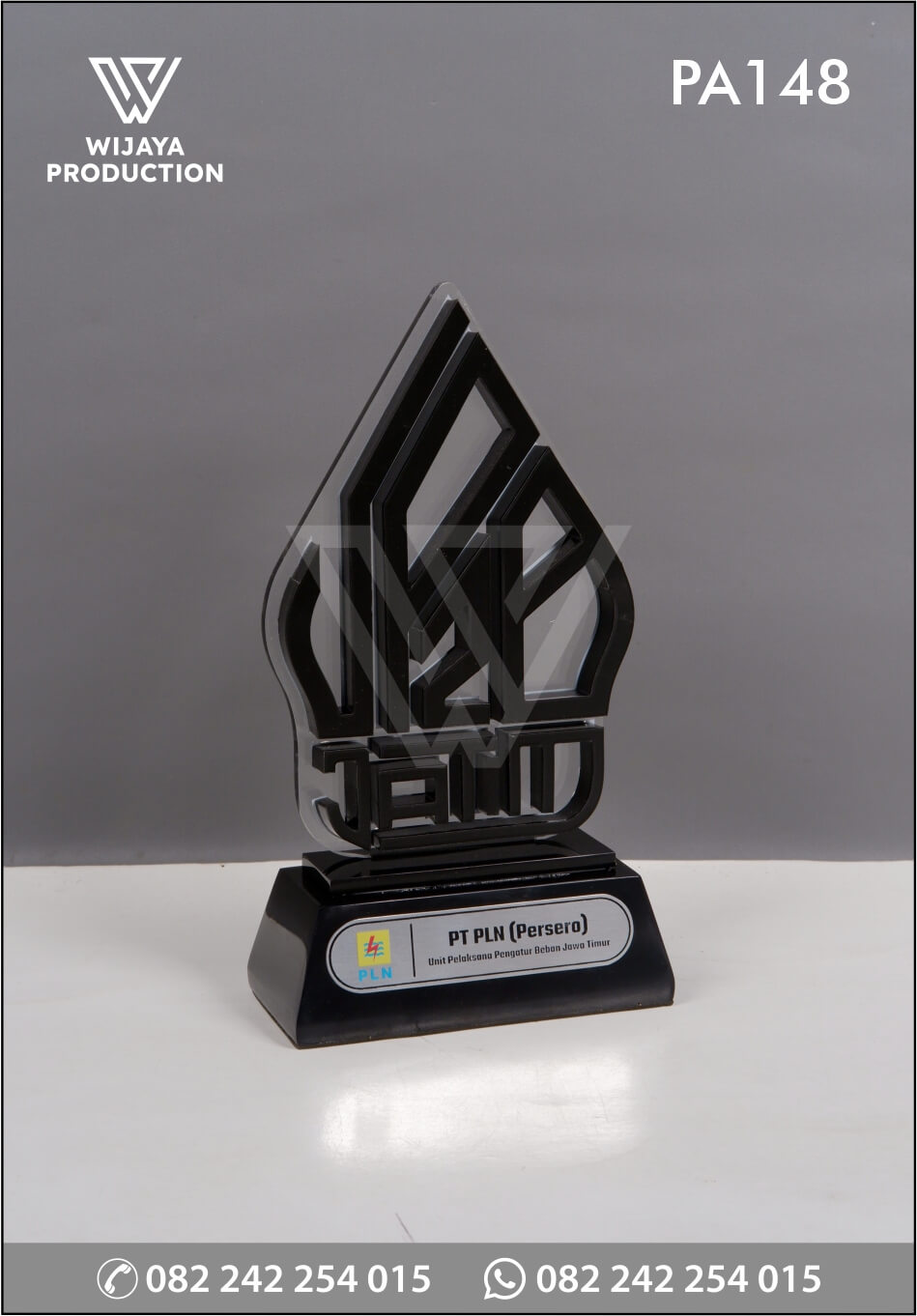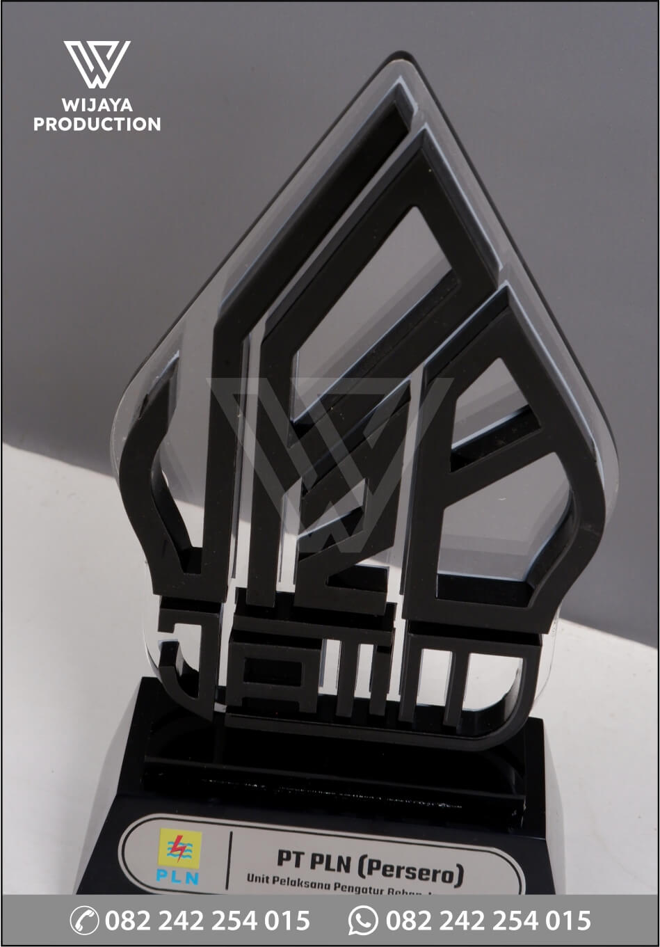 Salah satu cinderamata kenangan yang di aplikasikan ke dalam bentuk plakat. Plakat PLN Unit Pelaksana Pengatur Beban Jawa Timur yang bisa dijadikan referensi desain untuk Anda. Terbuat dari material akrilik bening dan hitam dengan bentuk custom yang sudah disesuaikan. Untuk bagian dudukan menggunakan material kayu warna hitam doff.