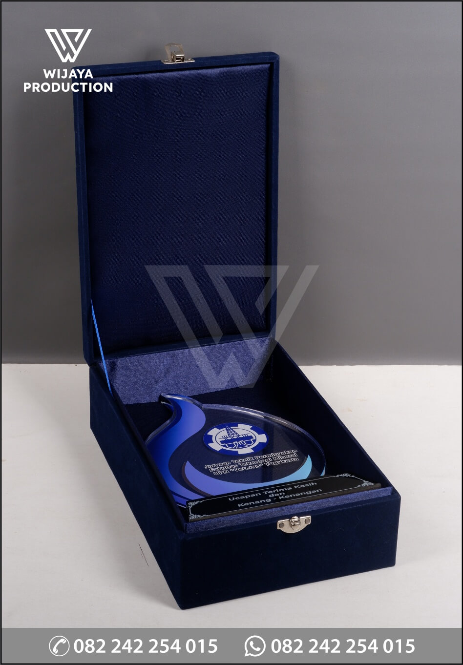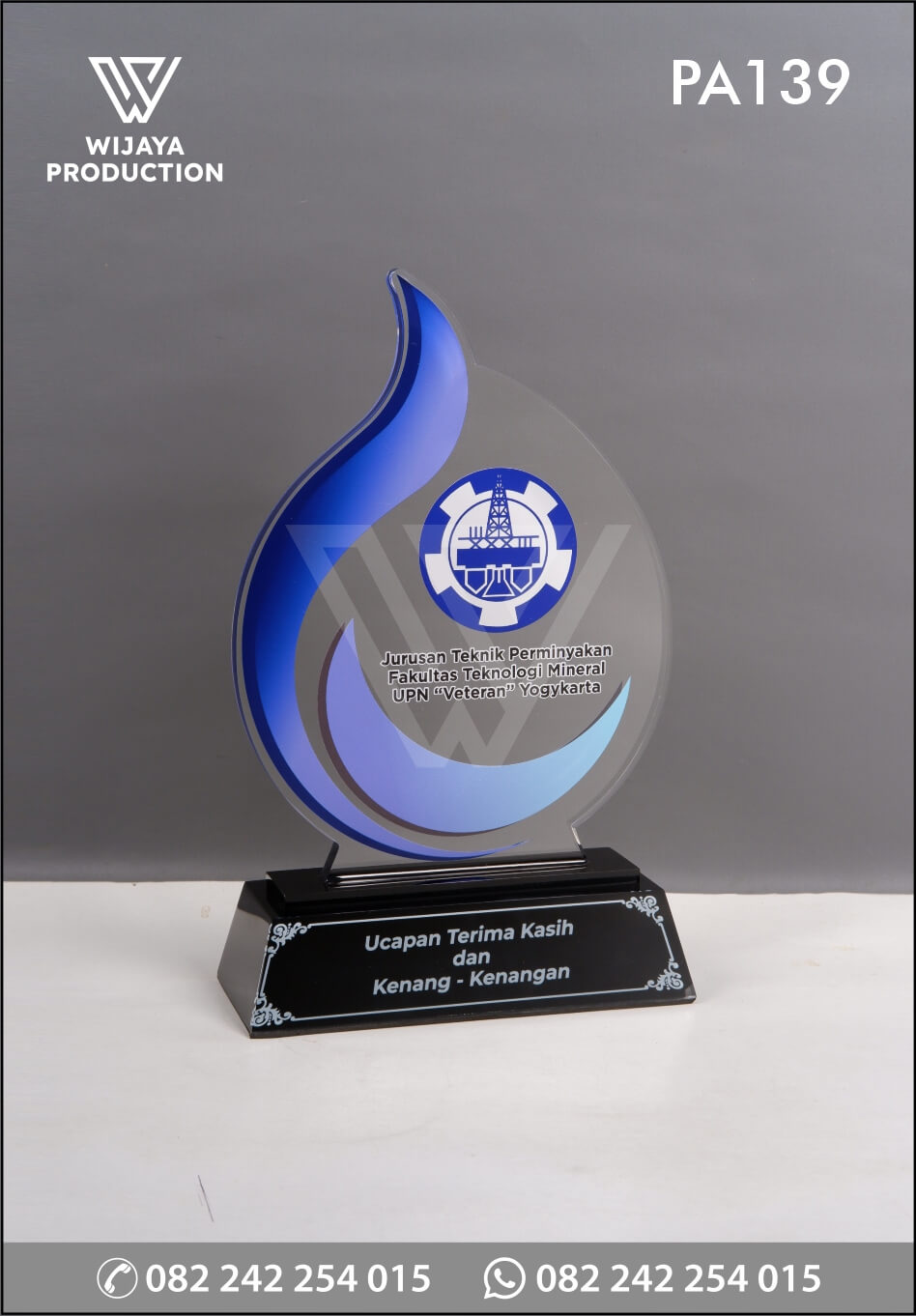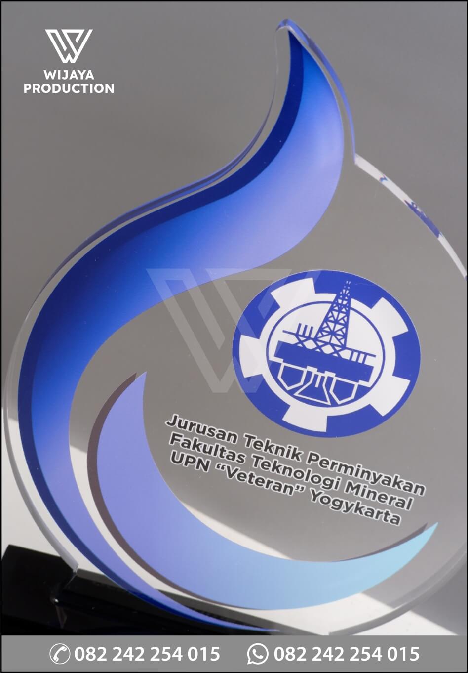 Salah satu tandamata kenangan yang di aplikasikan ke dalam bentuk plakat. Plakat UPN Veteran Yogyakarta yang bisa dijadikan referensi desain untuk Anda. Terbuat dari material akrilik dengan bentuk custom yang sudah disesuaikan menggunakan teknik uv print. Untuk bagian dudukan menggunakan material resin solid warna hitam.