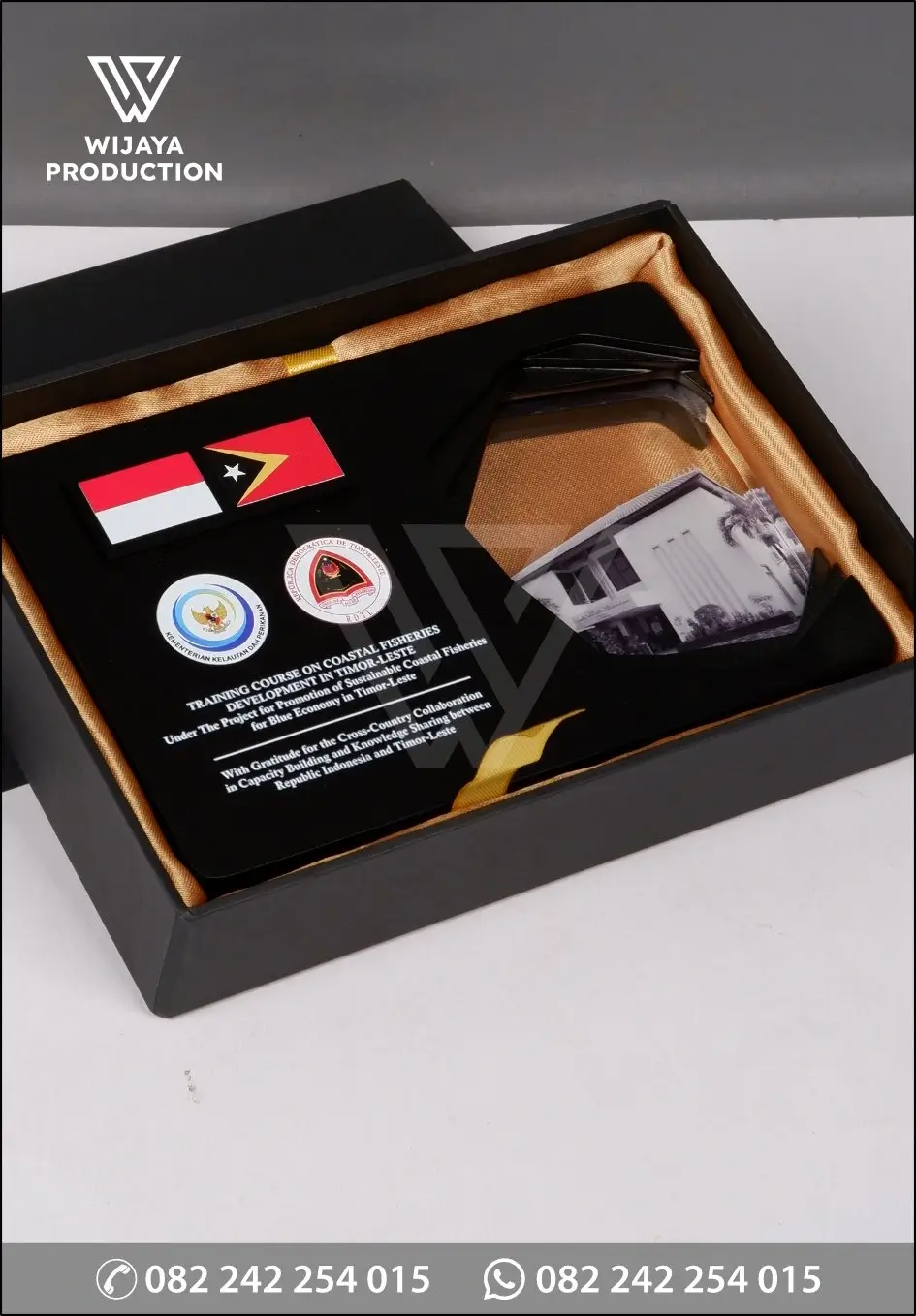 Desainnya yang eksklusif menonjolkan detail bendera negara dan logo instansi timbul, menjadikannya sangat representatif untuk hubungan diplomatik maupun kemitraan internasional. Dengan aksen potongan geometris pada bingkai kayu, plakat ini menciptakan tampilan yang dinamis, mewah, dan berwibawa untuk setiap acara seremonial.