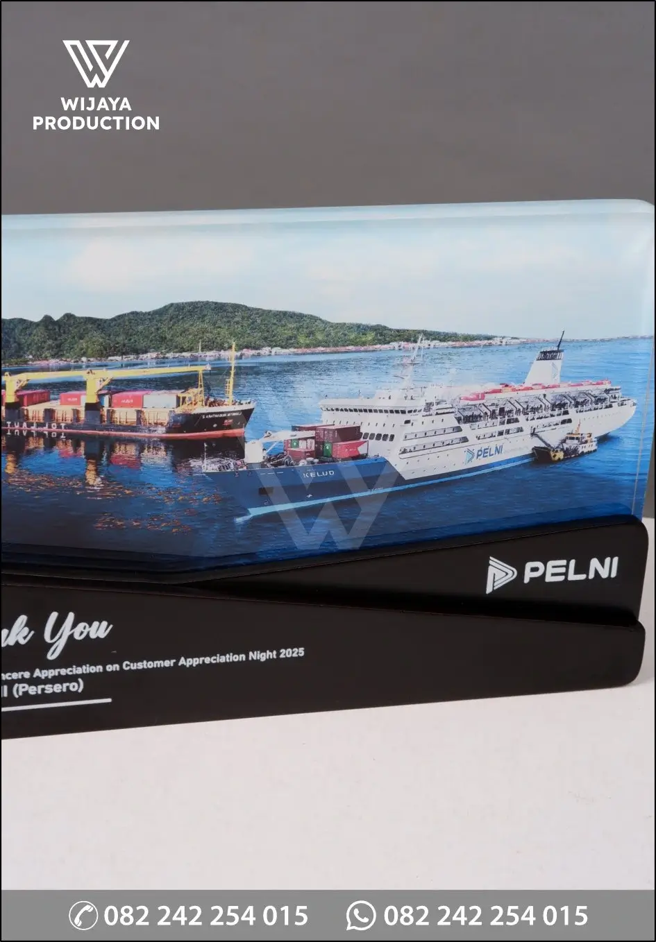 Plakat Kayu Akrilik PT Pelni mengusung desain modern dengan perpaduan kayu solid finishing hitam dan akrilik transparan custom print. Visual foto full color beresolusi tinggi memberikan tampilan realistis, rapi, dan profesional, cocok untuk kebutuhan branding dan apresiasi korporat.
