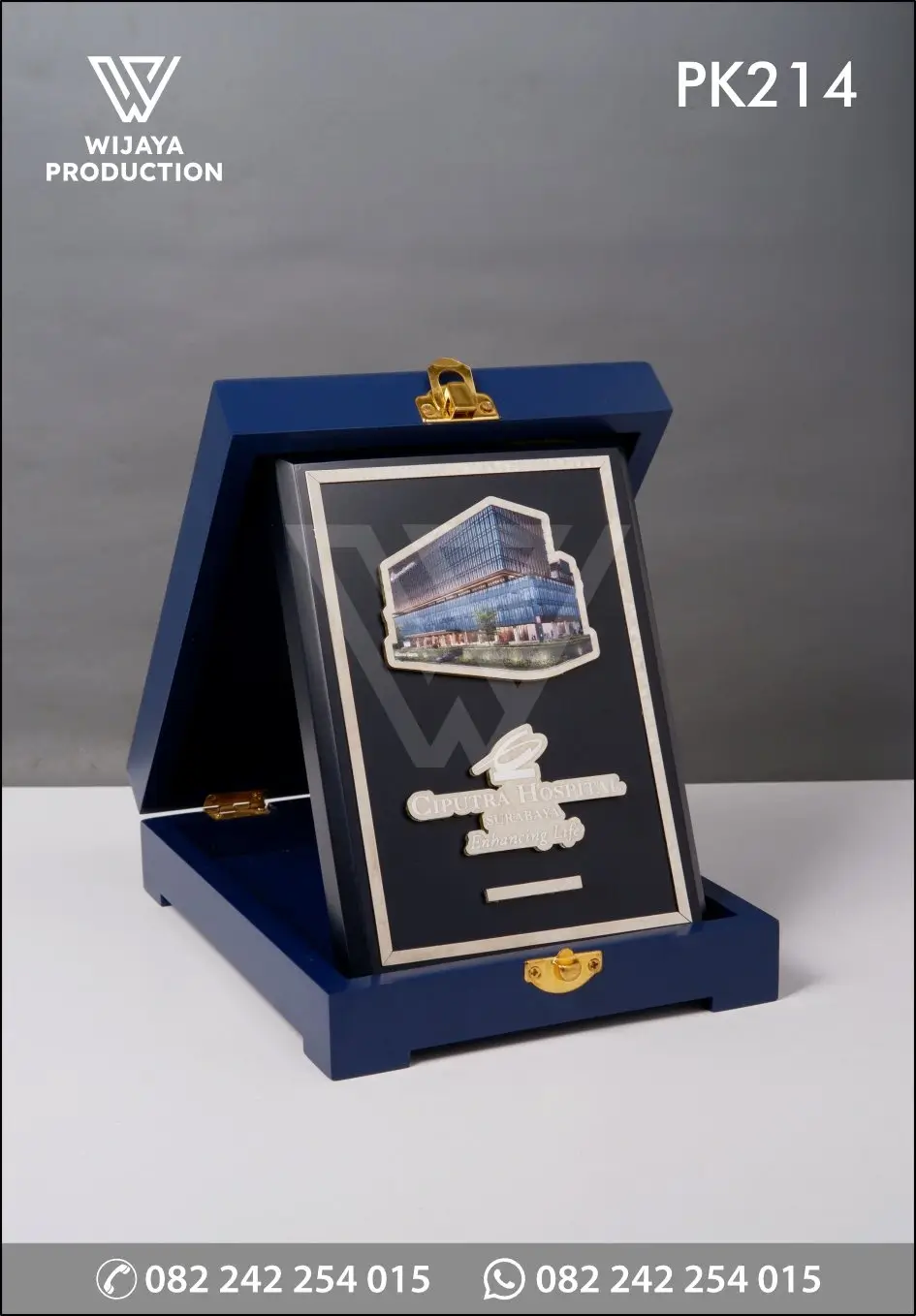 Plakat Kayu Box Ciputra Hospital Surabaya hadir dengan desain box eksklusif bernuansa profesional, menggunakan kayu solid finishing biru & hitam elegan yang dipadukan dengan plat logam custom. Detail visual gedung dan logo dibuat presisi, memberikan kesan modern, resmi, dan berkelas.