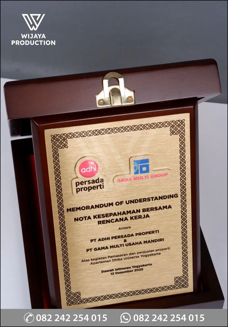 Bagian dalam plakat dipercantik dengan panel logam berwarna emas bertekstur brushed yang eksklusif, dibingkai dengan motif ornamen etsa yang sangat detail di sepanjang pinggirnya. Penggunaan logo instansi yang dicetak secara timbul dan berwarna memberikan dimensi visual yang tegas dan berwibawa. Dikemas dalam box kayu premium dengan lapisan beludru merah serta kunci pengaman emas, plakat ini menjadi pilihan utama untuk mengabadikan momen penting kesepakatan antar lembaga.