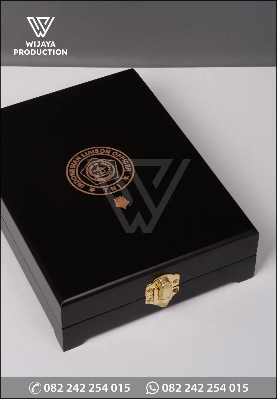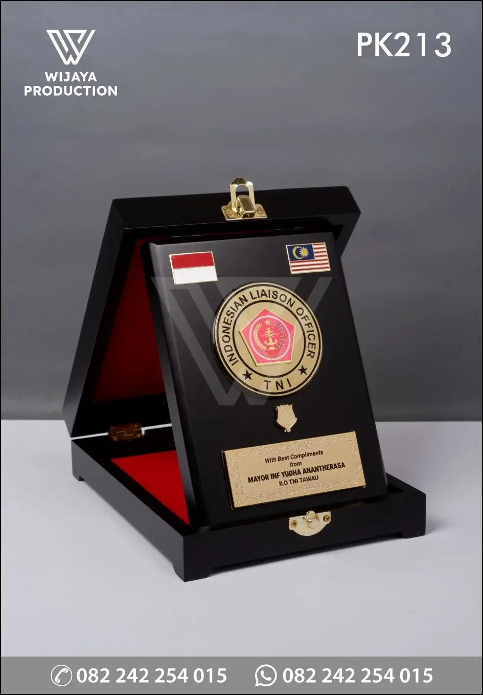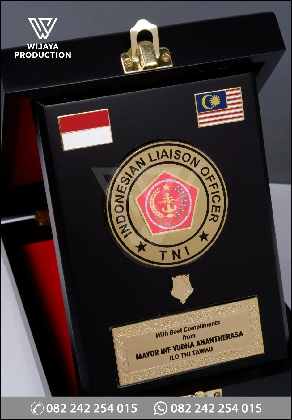 Plakat Kayu Box TNI Indonesian Liaison Officer tampil eksklusif dengan desain box elegan, menggunakan kayu solid finishing hitam yang dipadukan dengan plat logam custom. Detail emblem, bendera, dan teks berlapis emas memberikan kesan resmi, mewah, dan berwibawa.