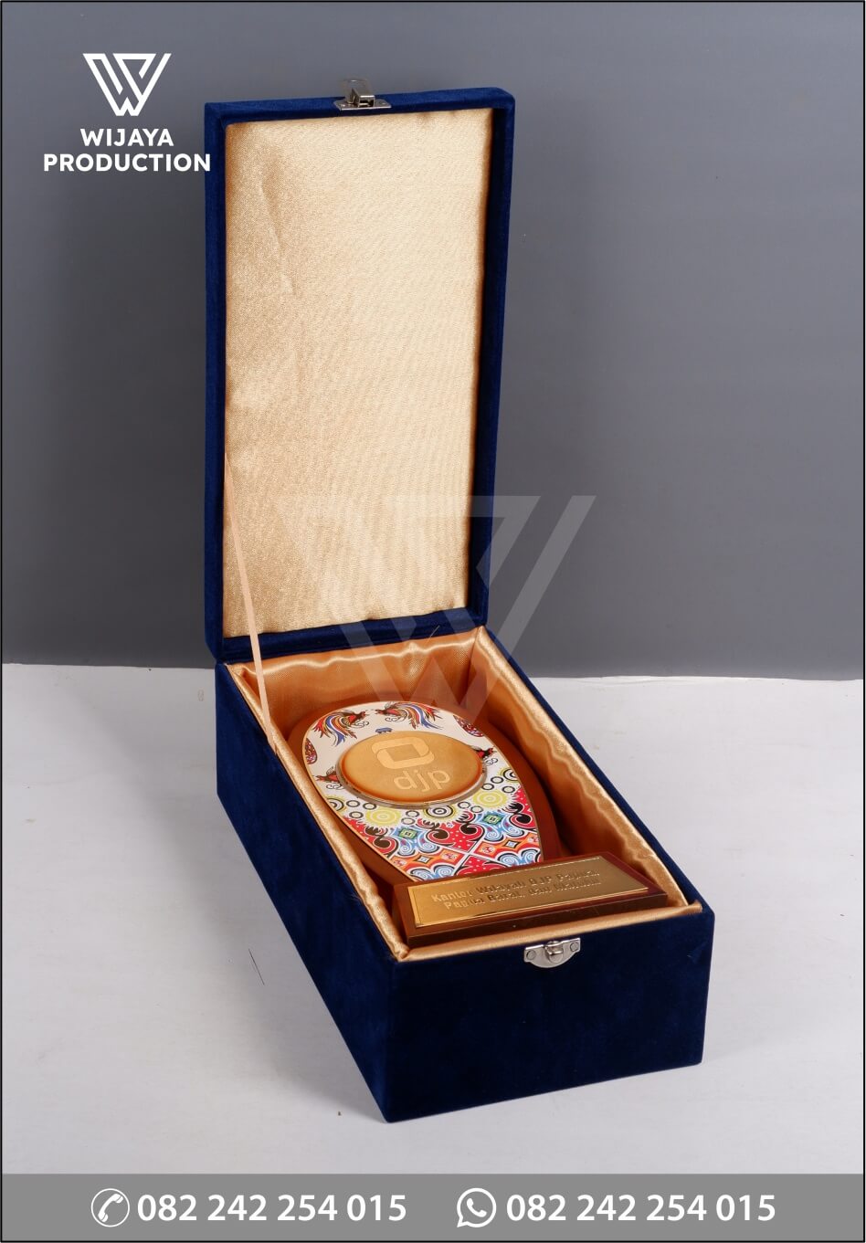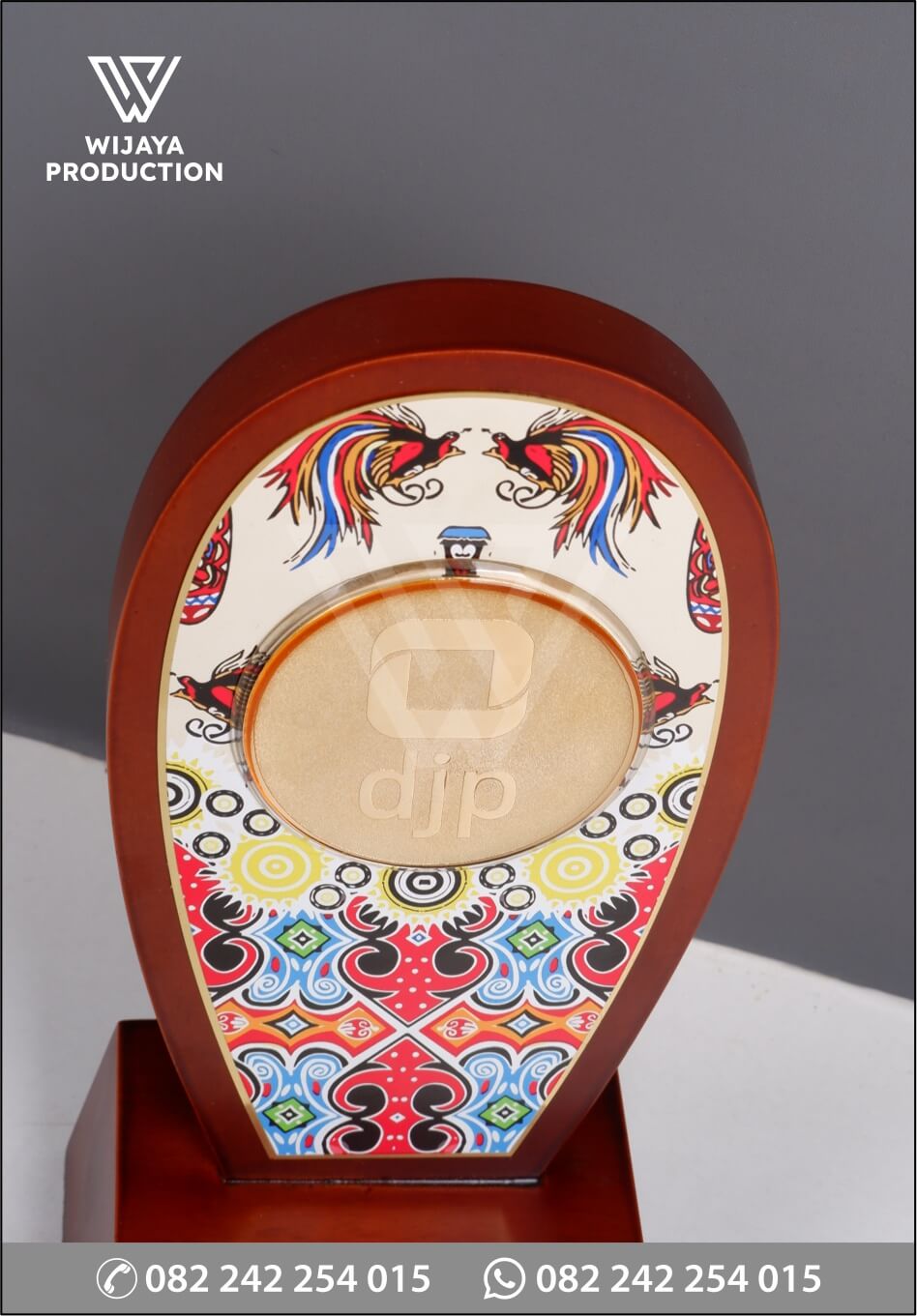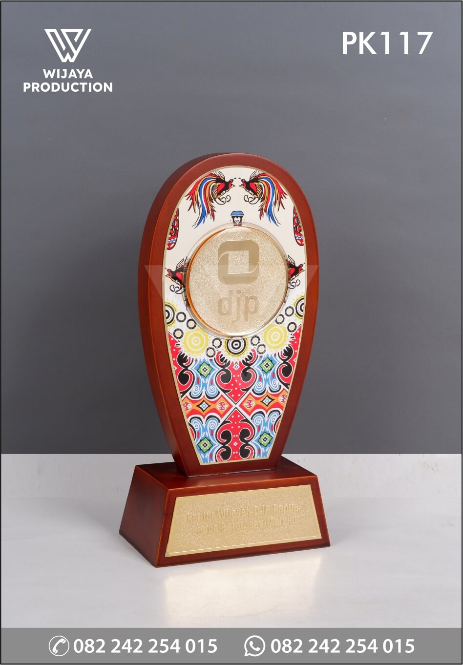 Sebagai bentuk tandamata kenangan atau penghargaan dalam suatu acara, plakat menjadi hal penting yang berfungsi sebagai penanda. Berikut ini merupakan plakat kayu Kantor Wilayah DJP Papua yang bisa dijadikan referensi desain untuk Anda. Plakat yang terbuat dari perpaduan material kayu dan logam. Material kayu dengan bentuk model desain custom dikombinasikan dengan logam kuningan chrome emas etsa masir membentuk logo djp dan uv print untuk materi gambar motif khas papua.