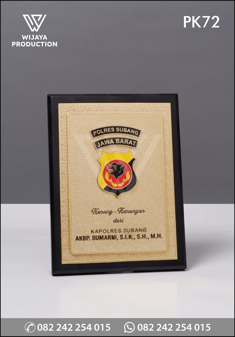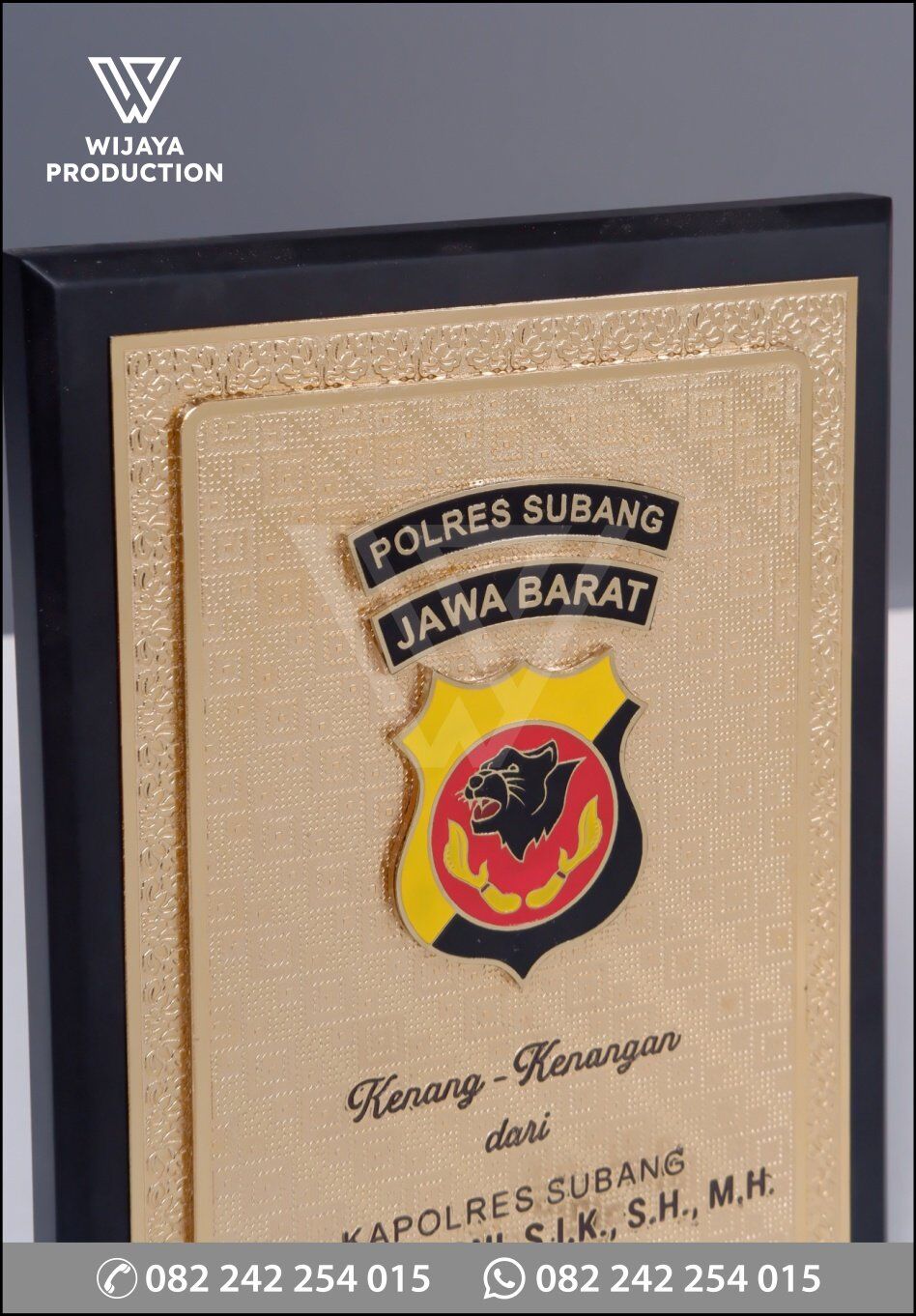Sebagai bentuk tandamata kenang-kenangan dalam suatu acara, plakat menjadi hal penting yang berfungsi sebagai penanda. Berikut ini merupakan plakat kayu Polres Subang Jawa Barat yang bisa dijadikan referensi desain untuk Anda. Plakat yang terbuat dari material kayu warna hitam doff dengan bentuk persegi panjang, dikombinasikan dengan logam kuningan finishing chrome emas etsa cat untuk materi gambar logo dan tulisan yang sudah disesuaikan.