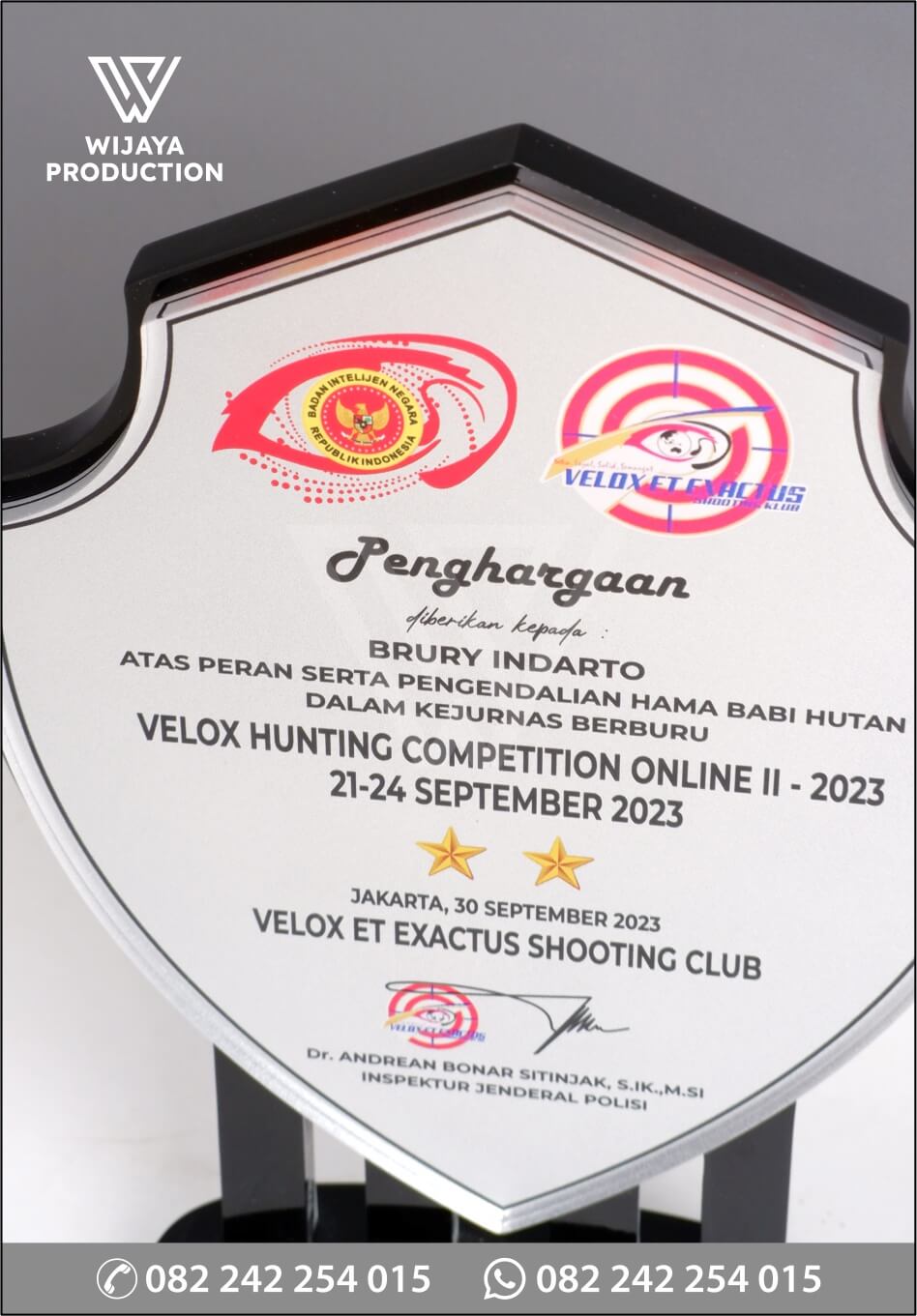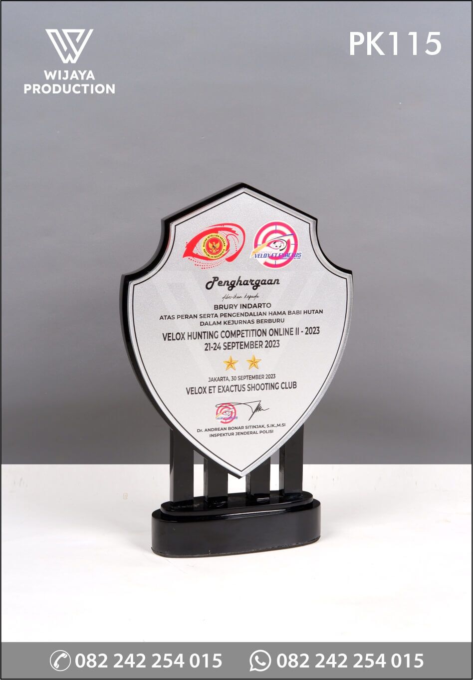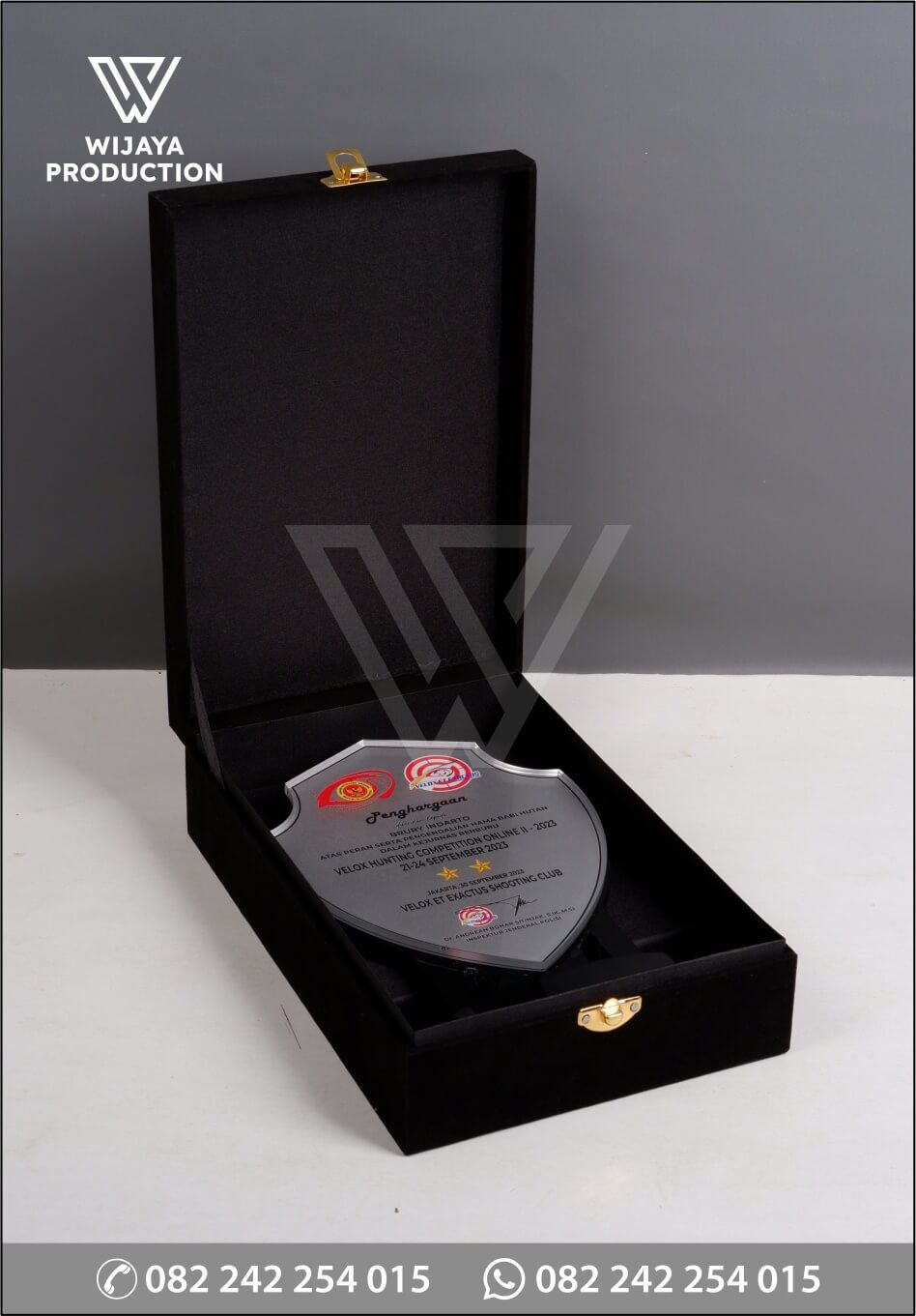 Salah satu bentuk penghargaan Velox Hunting Competition Online yang diaplikasikan ke dalam bentuk plakat. Plakat yang bisa dijadikan referensi desain untuk Anda. Terbuat dari perpaduan material kayu hitam dan akrilik dengan bentuk model perisai berisikan materi gambar logo dan tulisan yang menggunakan teknik uv print flatbed.