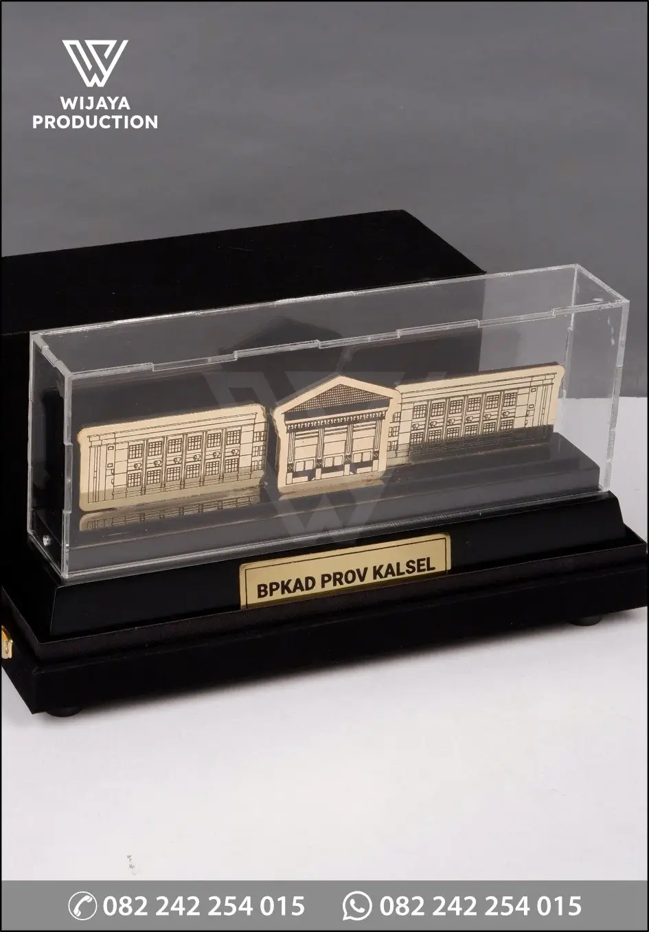 Plakat Logam PL109 dirancang sebagai plakat penghargaan dan cinderamata institusional dengan tampilan miniatur gedung yang representatif dan berkelas. Siluet bangunan BPKAD Provinsi Kalimantan Selatan ditampilkan secara presisi menggunakan teknik cutting dan engraving logam, menghasilkan detail arsitektur yang rapi, tegas, dan profesional.