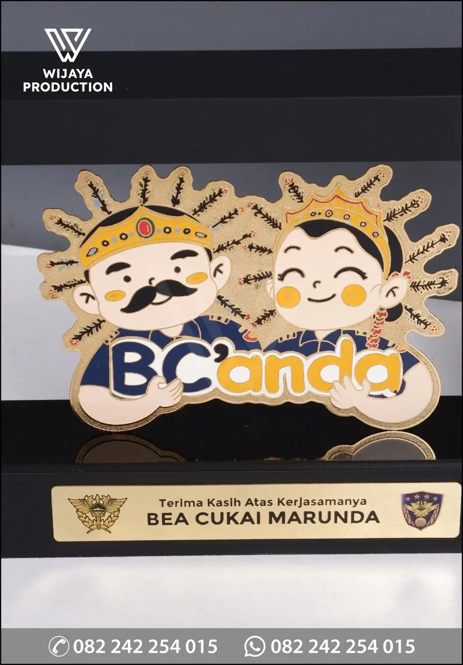 Plakat eksklusif ini dirancang khusus untuk Bea Cukai Marunda sebagai tanda terima kasih atas kerjasama yang telah terjalin. Dengan desain yang menampilkan dua karakter kartun dengan tulisan “BC’anda” dan plat kuningan bertuliskan “Terima Kasih Atas Kerjasamanya BEA CUKAI MARUNDA,” plakat ini sangat cocok untuk mengapresiasi kontribusi dan kerjasama dalam bidang kepabeanan.