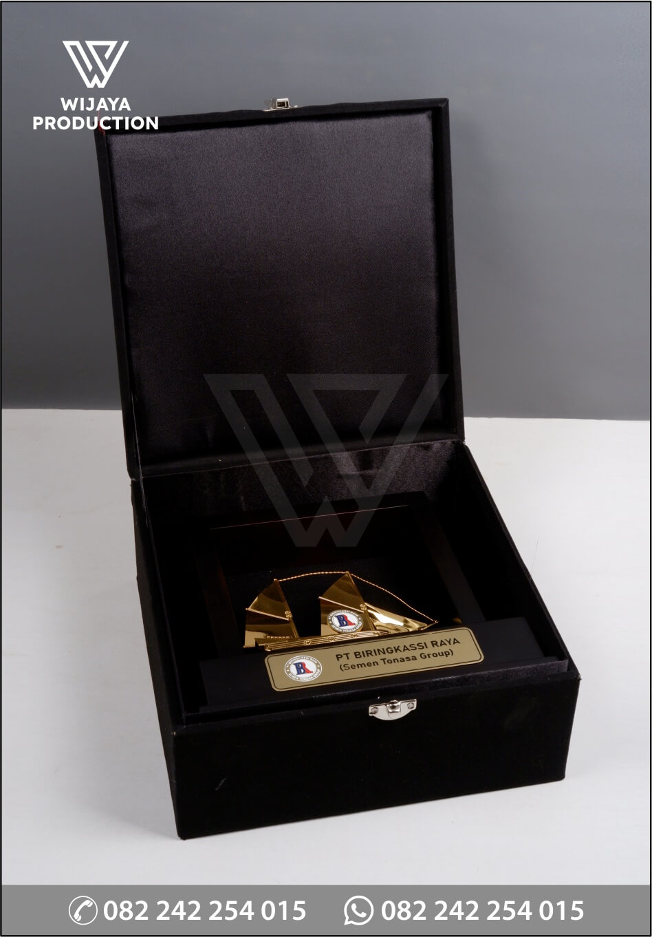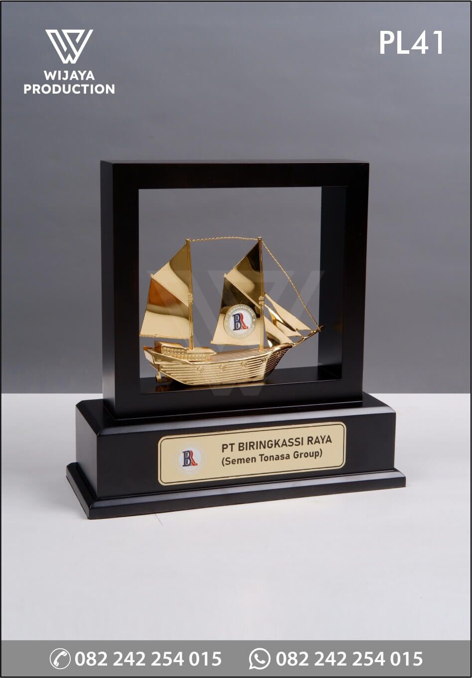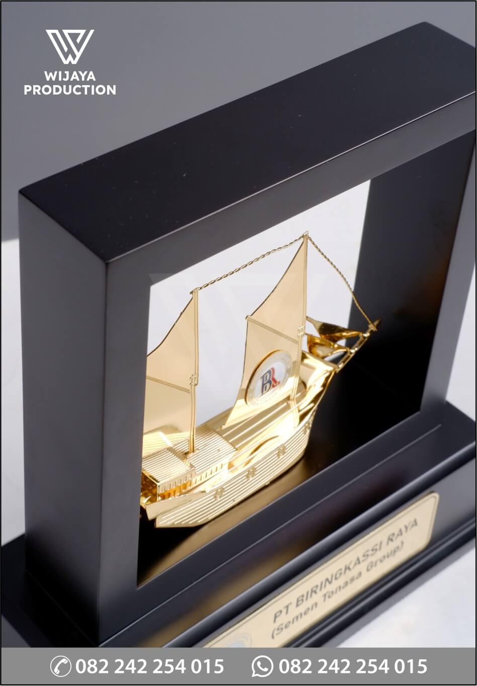 Sebagai bentuk tanda kenangan atau penghargaan dalam suatu acara, plakat menjadi hal penting yang berfungsi sebagai penanda. Berikut ini merupakan plakat logam frame PT Biringkassi Raya yang bisa dijadikan referensi desain untuk Anda. Plakat yang terbuat dari material logam kuningan finishing chrome emas glossy yang membentuk kapal pinisi. Untuk bagian base atau dudukan dibuat custom frame disertai plat kuningan materi tulisan event terkait.