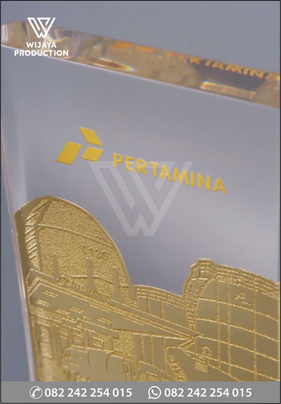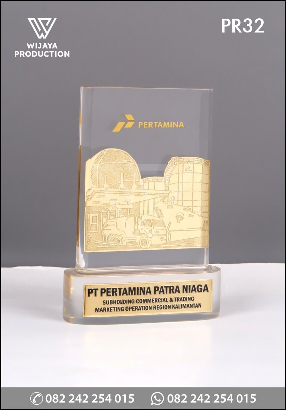Salah satu bentuk penghargaan PT Pertamina Patra Niaga Subholding Commercial & Trading. Plakat yang bisa jadi pilihan referensi desain untuk Anda. Terbuat dari material resin transparan bening yang dikombinasikan dengan logam kuningan finishing chrome emas etsa masir membentuk siluet bangunan dan kendaraan dari Pertamina.