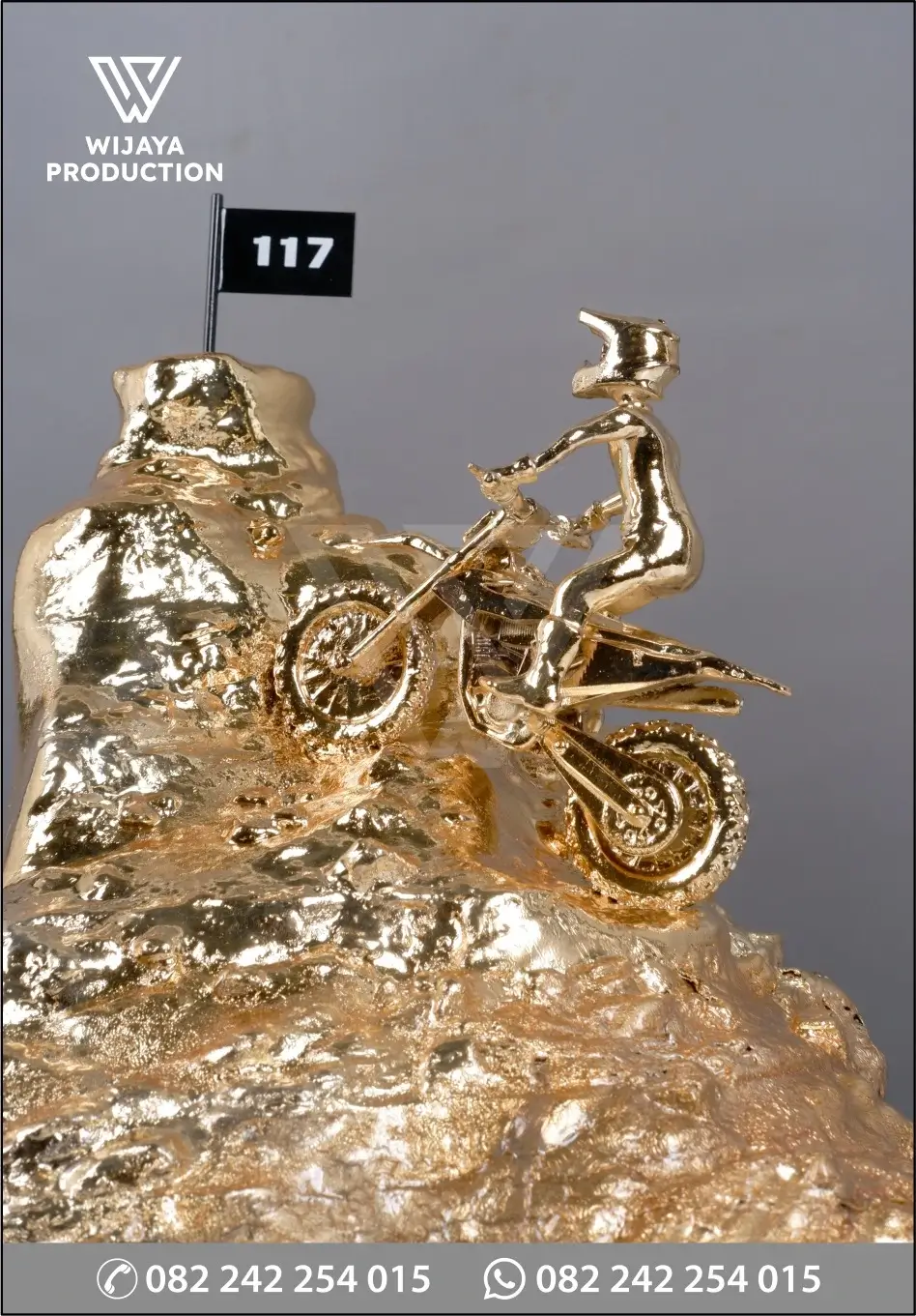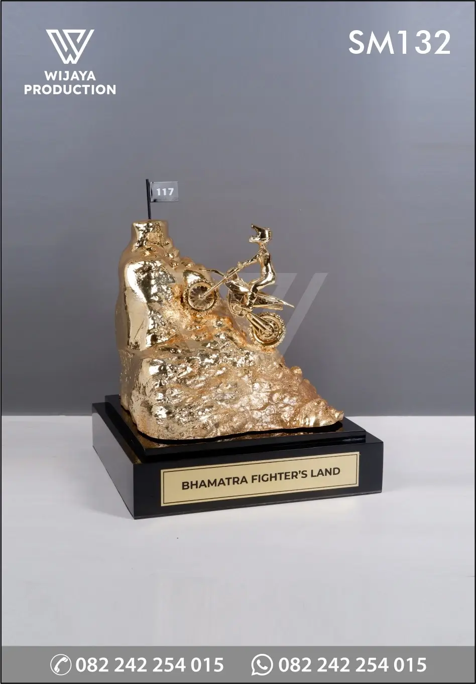 Salah satu bentuk karya seni kerajinan berupa souvenir miniatur yang dibuat sebagai bentuk cinderamata atau penghargaan Bhamatra Fighter Land. Miniatur yang terbuat dari perpaduan material logam kuningan dan resin dengan finishing chrome emas glossy yang membentuk model rider motocross yang sedang melewati rintangan. Untuk bagian bawah miniatur di alasi akrilik hitam dan dudukan menggunakan material kayu warna hitam doff.