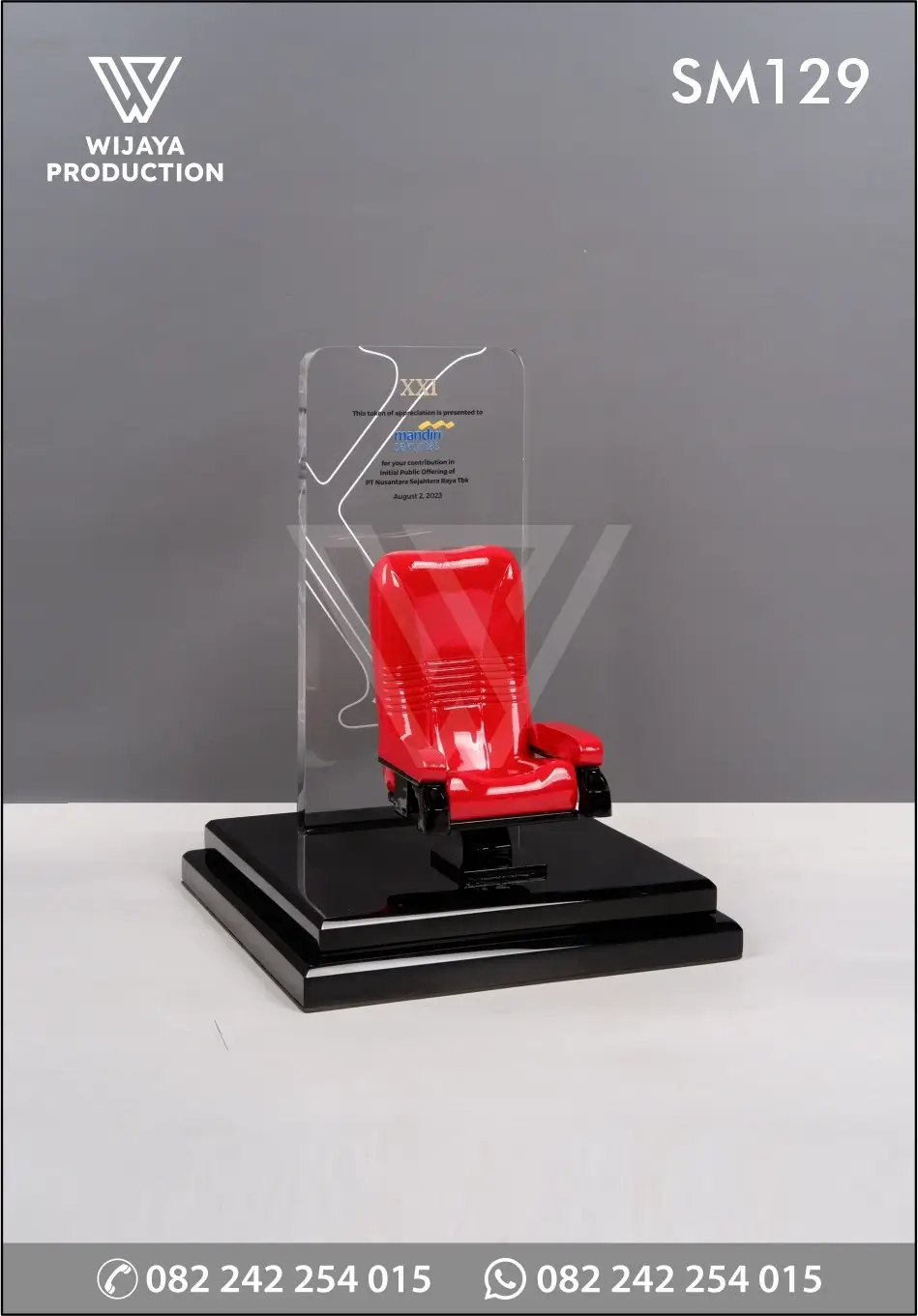 Salah satu bentuk karya seni kerajinan berupa souvenir miniatur yang dibuat sebagai bentuk cinderamata atau penghargaan. Miniatur yang terbuat dari material resin cor finishing warna merah yang membentuk kursi bioskop XXI. Serta penggunaan akrilik bening berisi materi tulisan dan gambar uv print. Untuk bagian dudukan menggunakan material resin solid warna hitam.