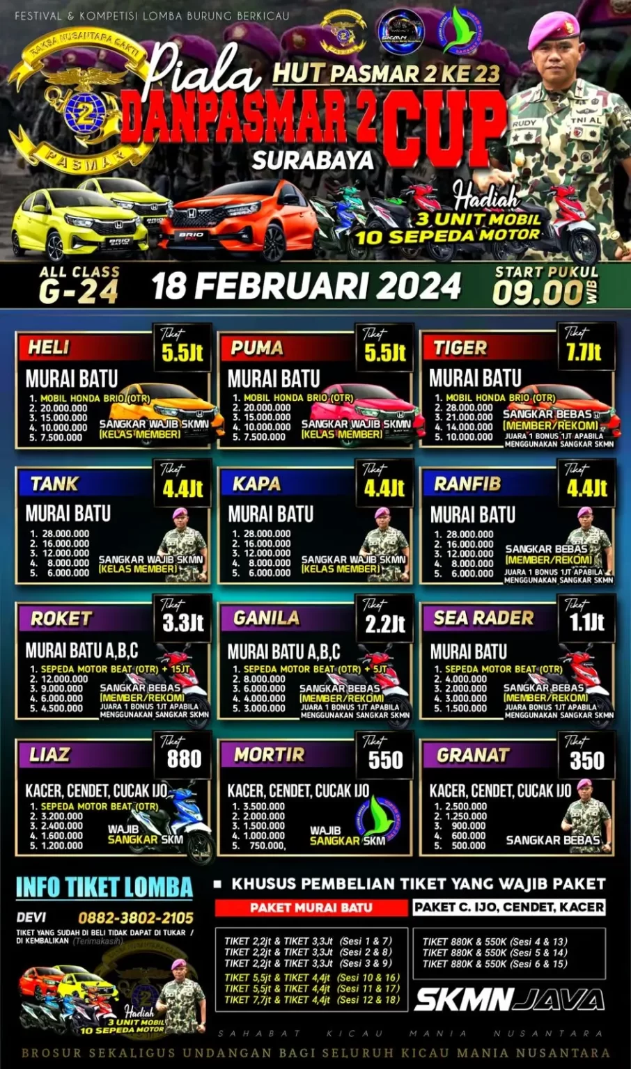 Ada beberapa Jenis burung yang di lombakan di antaranya Murai batu, Kacer, Cendet dan Cucak Ijo. Kategori yang di lombakan di antaranya : Heli, Puma, Tiger, Tank, Kapa, Ranfib, Roket, Ganila, Sea Rader, Liaz, Mortir, Granat. Memperebutkan beberapa hadiah yang cukup menarik di antaranya mobil, motor,dan berbagai hadiah menarik lainnya